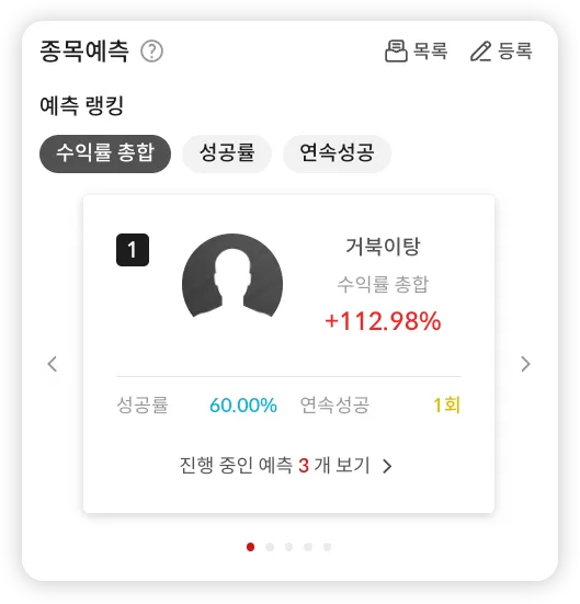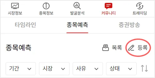 ※ 한번 등록한 종목예측은 삭제/수정이 불가능하며 수익률, 승률 등 실력지표에 반영되므로 신중히 등록해주시기 바랍니다.