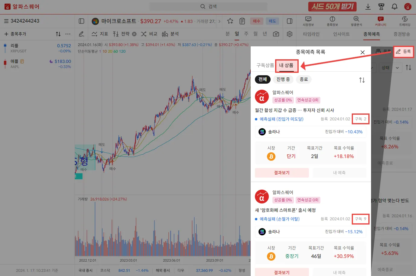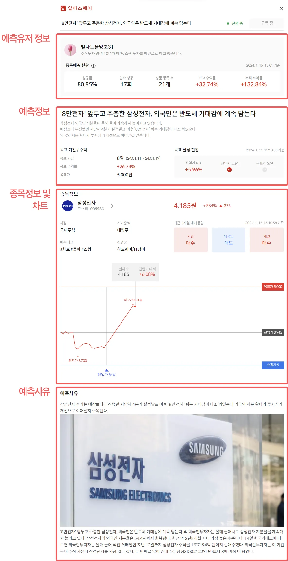 오를 것 같은 종목을 선별하여 목표 기간동안 예상되는 수익률을 예측하는 기능으로, 파트너는 유료 및 무료 예측을 판매할 수 있습니다.