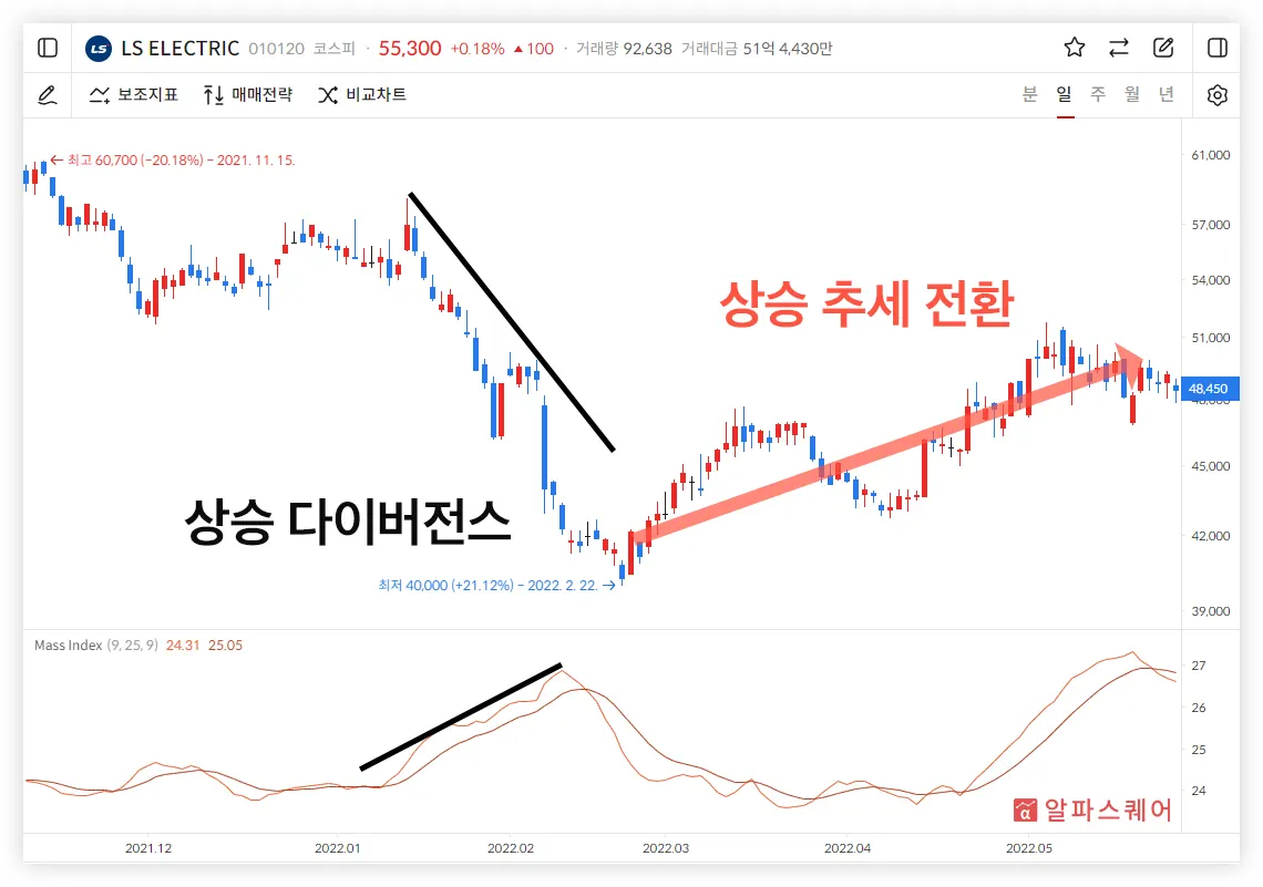 Mass Index의 증가는 주가 변동성의 증가로 곧 추세가 변화할 것을 예측할 수 있다. 이때, 주가는 감소하는 다이버전스가 발생한다면 추세가 전환되어 주가가 상승 추세에 오를 것을 예상하고 매수하는 전략을 사용할 수 있다.