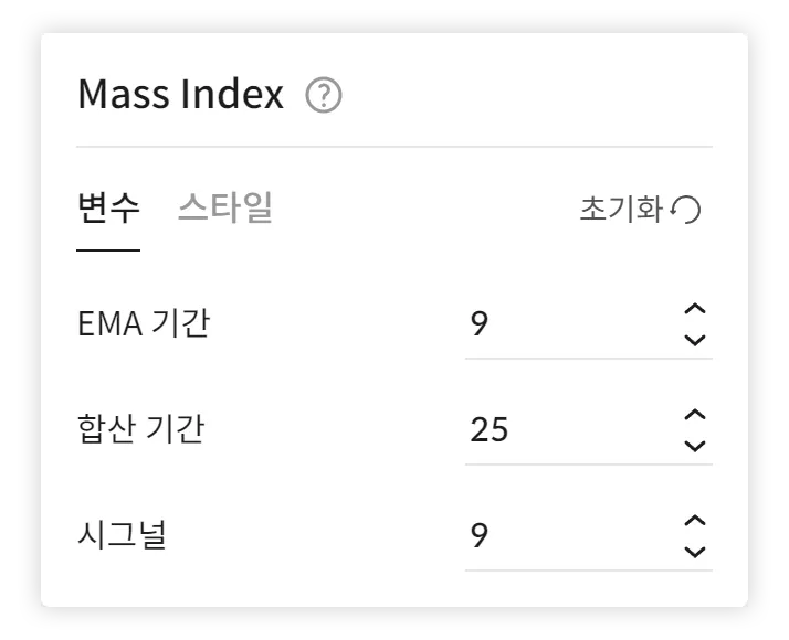 시그널 : Mass Index의 지수이동평균인 Signal을 구하는 기간이다. 기본값은 9