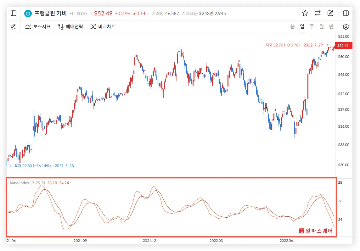 따라서 Mass Index의 값이 증가하면 현재 변동성이 과거에 비해 증가하는 중이라고 해석할 수 있고 반대로 감소하면 현재 변동성이 과거에 비해 감소하는 중이라고 해석할 수 있다.