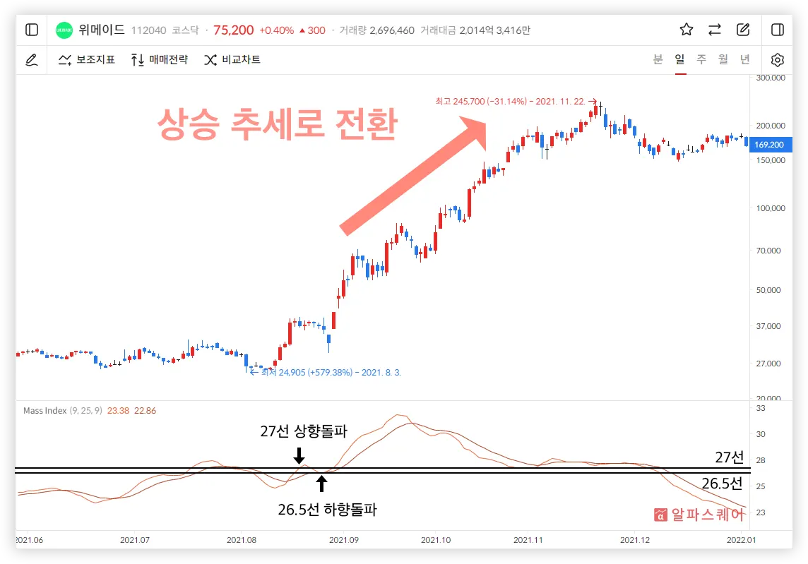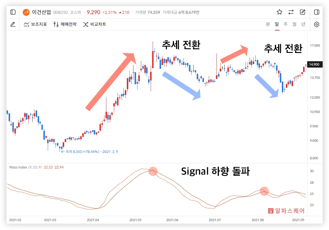 Mass Index의 지수이동평균선인 Signal은 추세 전환의 임계점을 찾기 어려울 때 활용할 수 있다.