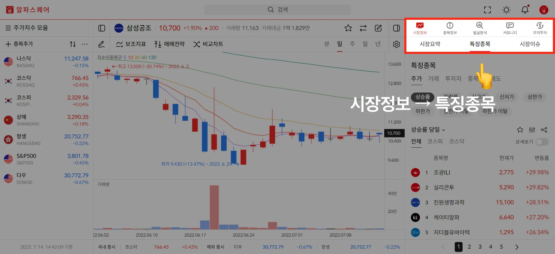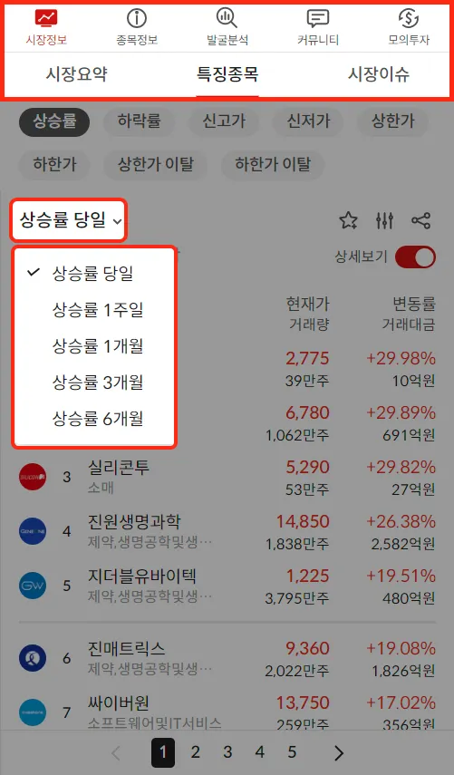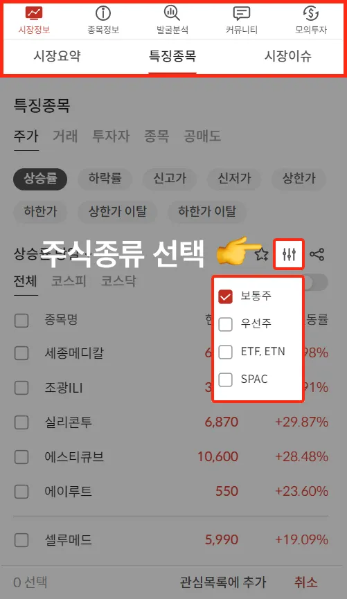 특징종목 결과에서 볼 주식 종류를 선택할 수 있습니다.