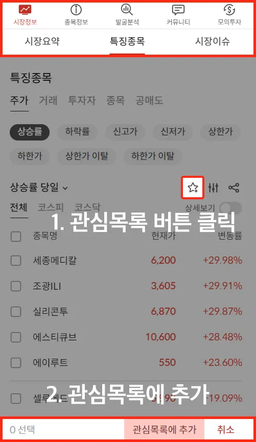 특징종목의 결과 종목들을 관심목록에 추가할 수 있습니다.