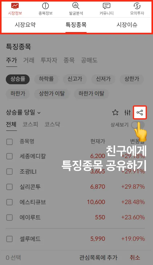 친구에게 특징종목의 결과 종목들을 공유할 수 있습니다.