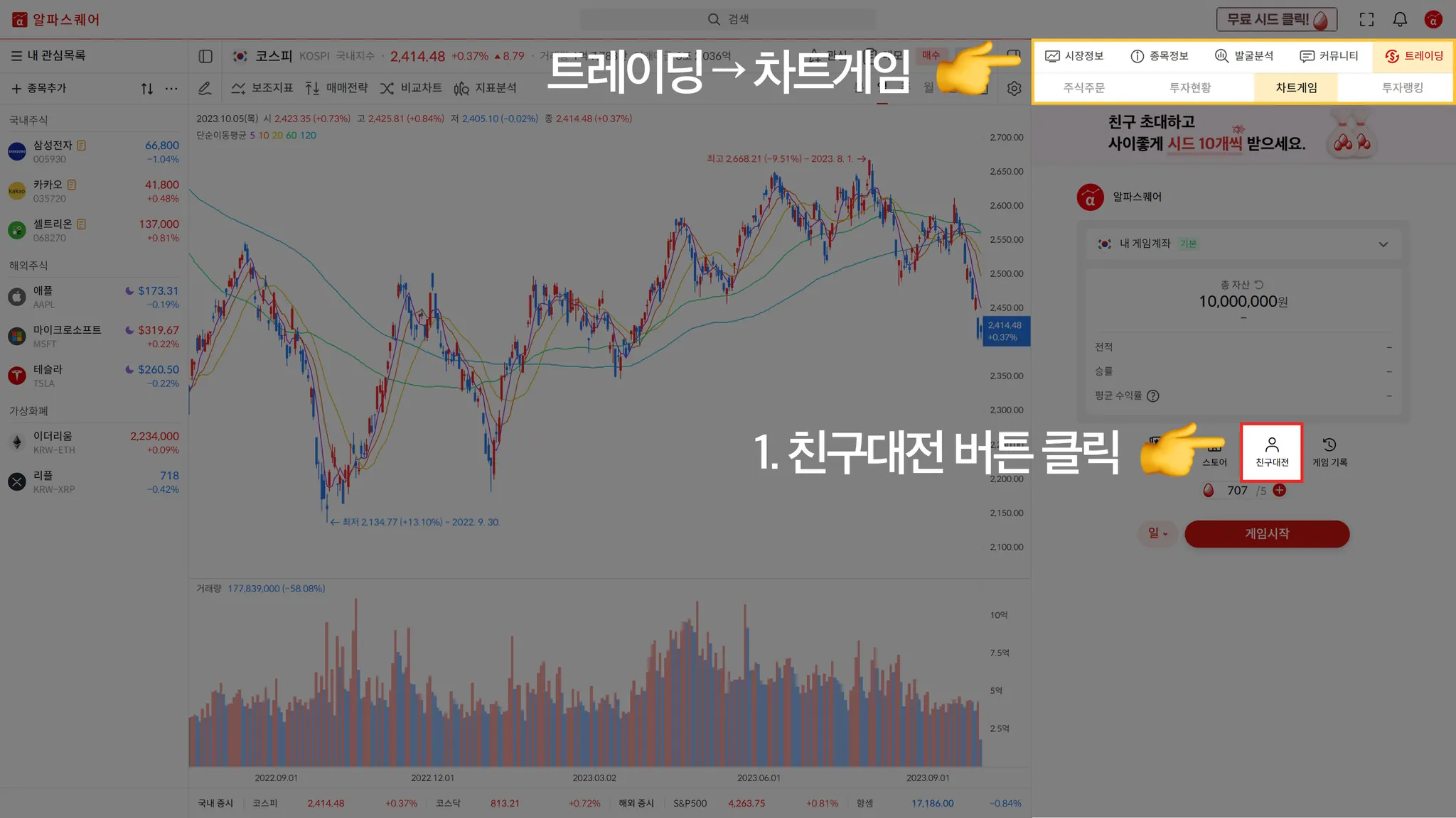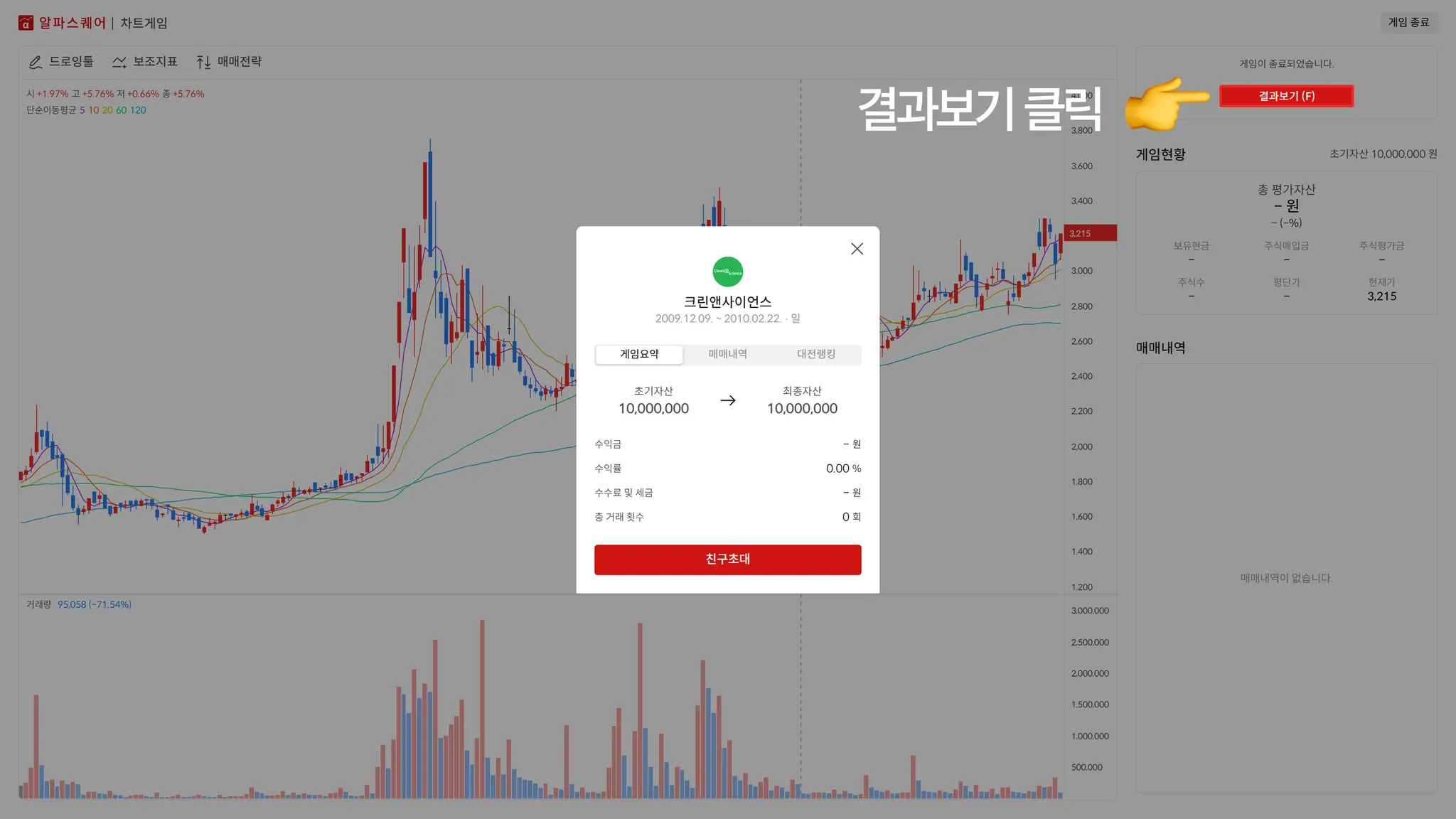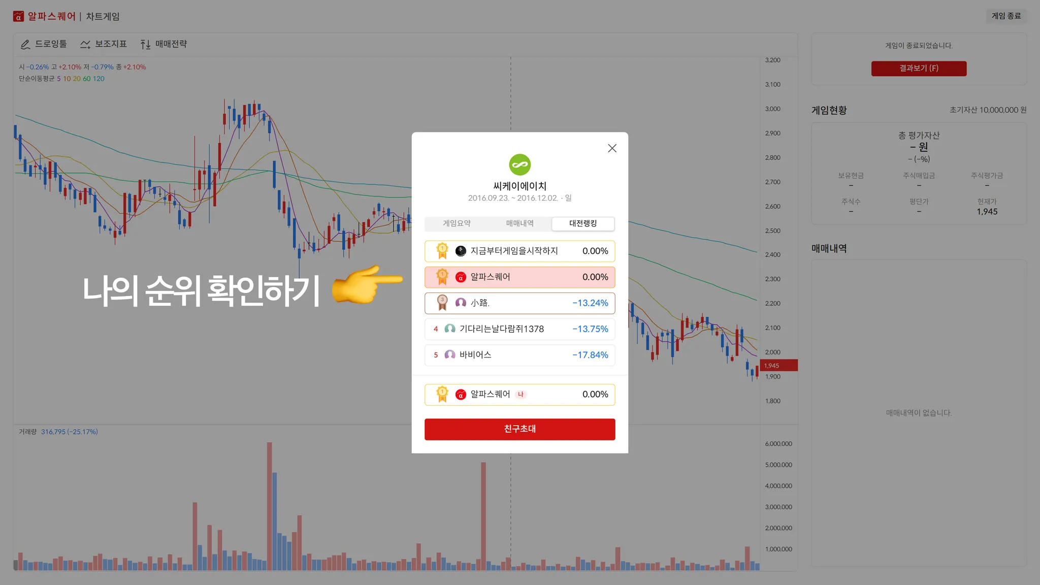차트게임의 친구대전 기능은 친구와 같은 차트로 게임을 진행하고 결과 수익률로 차트 실력을 겨뤄볼 수 있는 기능입니다.