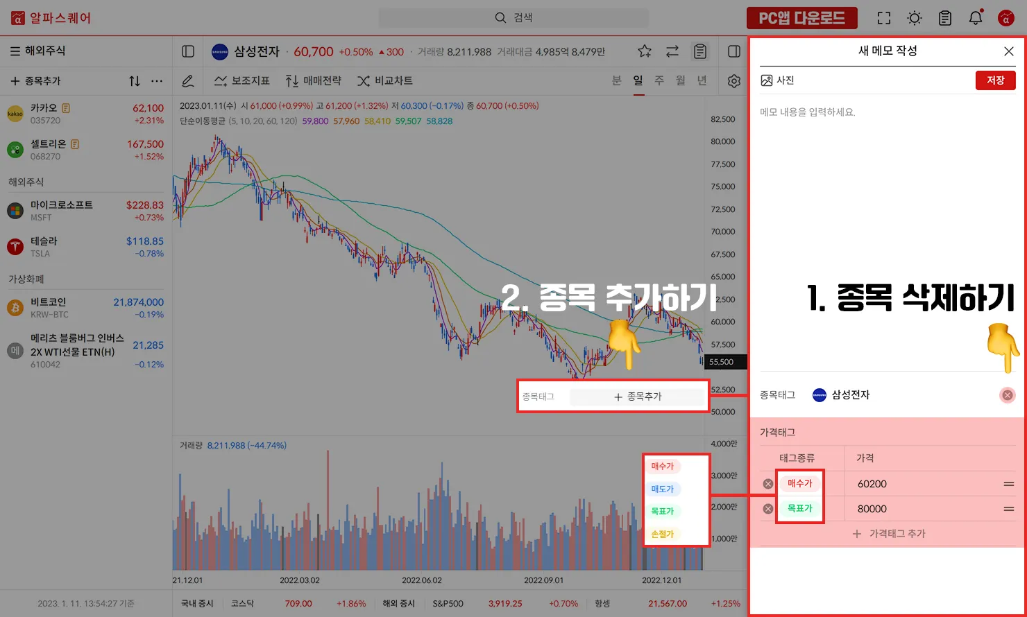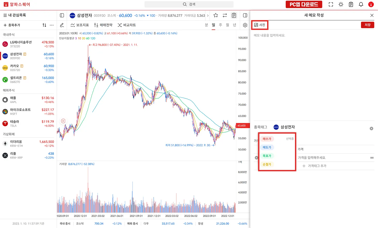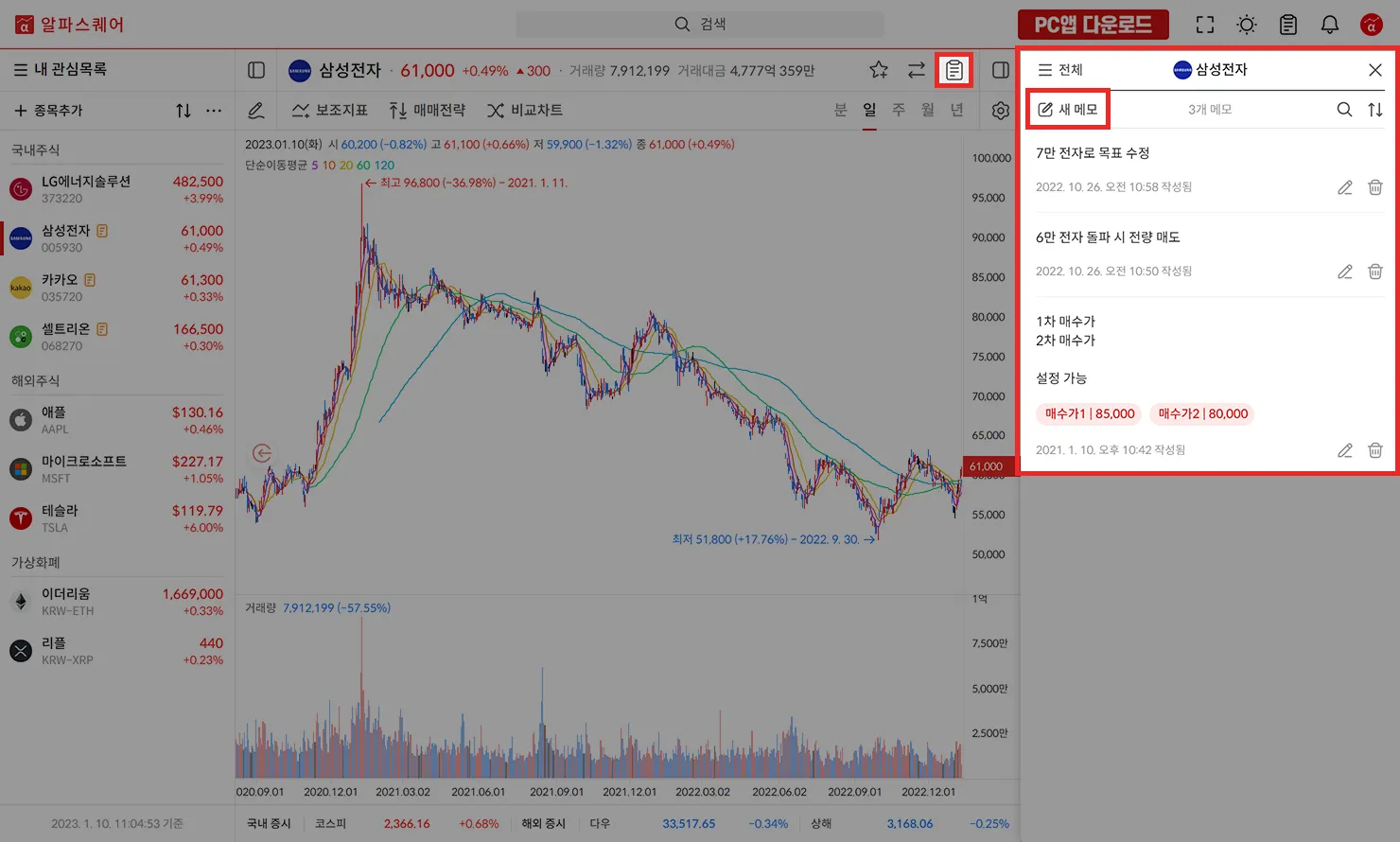 새 메모를 클릭해 메모를 작성할 수 있고 가격 종류 태그를 통해 매수가, 매도가, 손절가, 목표가 등을 표기할 수있습니다.