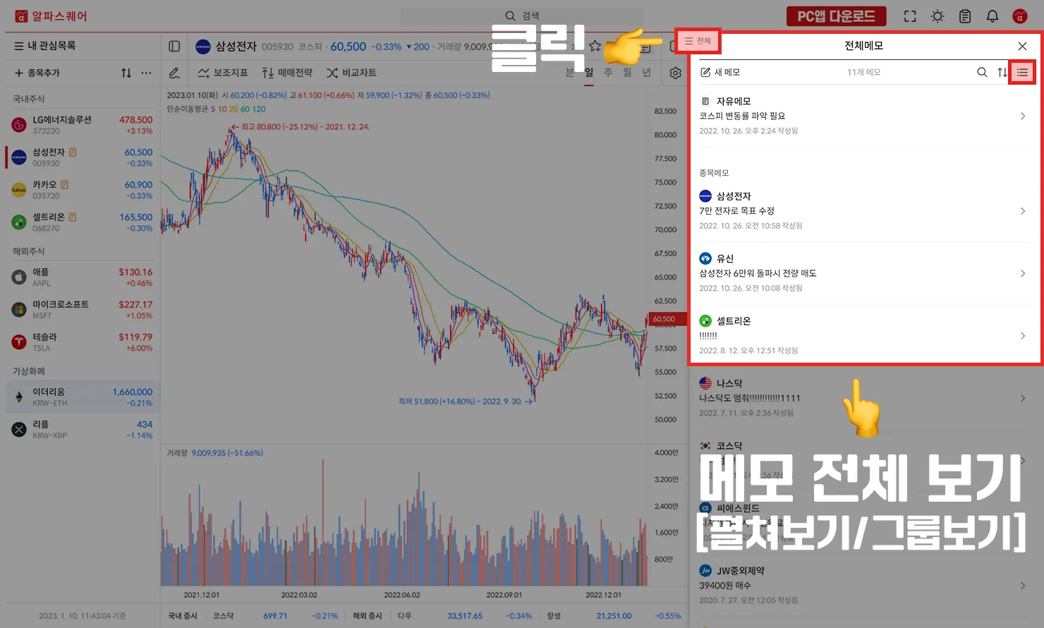 개별 종목에서 왼쪽 상단의 전체 버튼을 클릭하면 메모 전체를 확인할 수 있습니다.