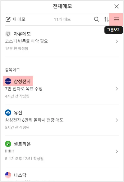 그룹보기: 종목별 가장 최신 메모를 볼 수 있고, 클릭 시 해당 종목 메모 전체를 확인
