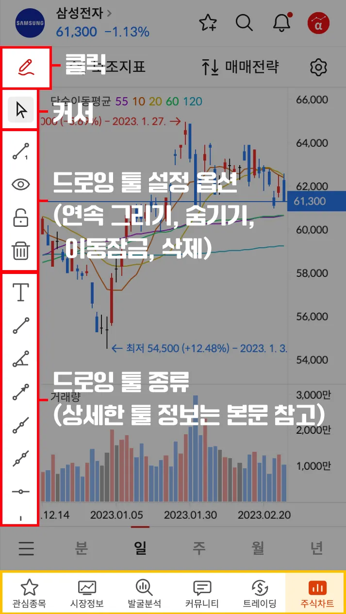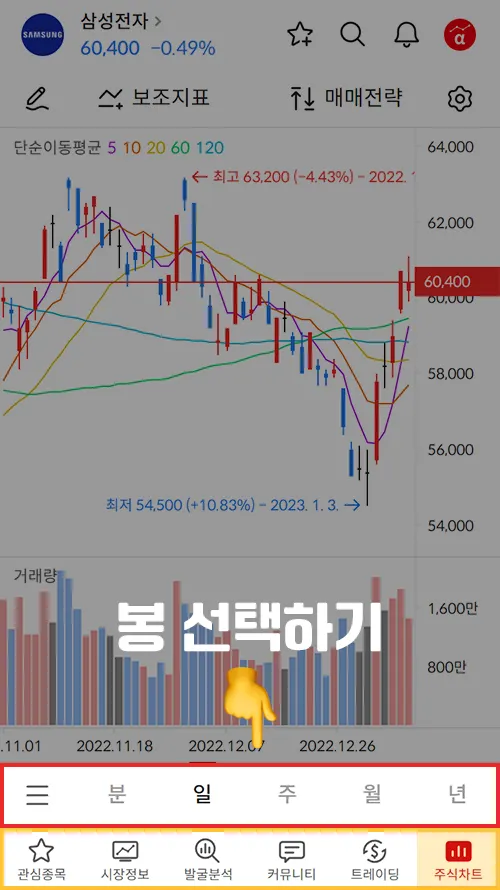 차트 하단의 봉 기간 선택 버튼 클릭