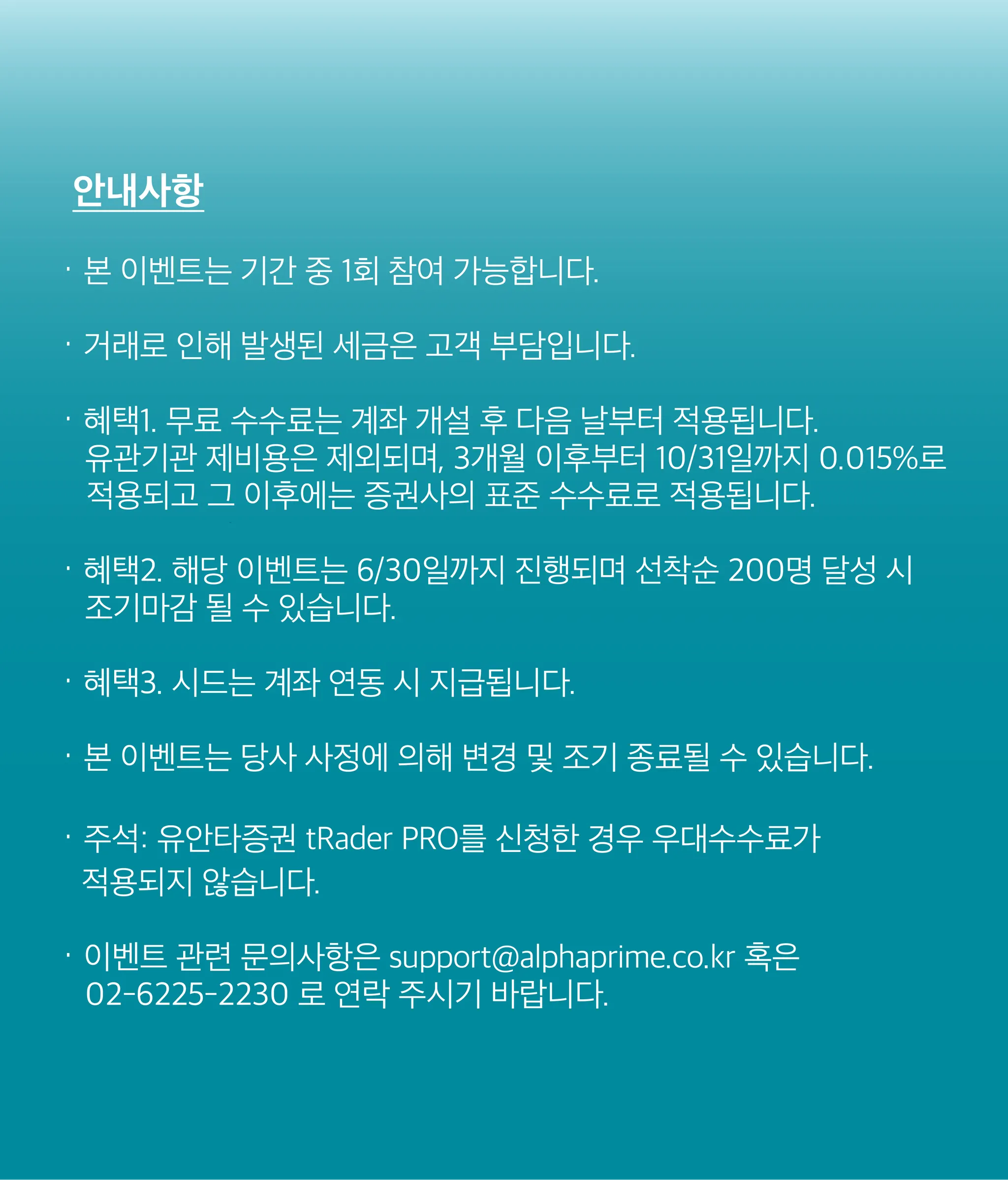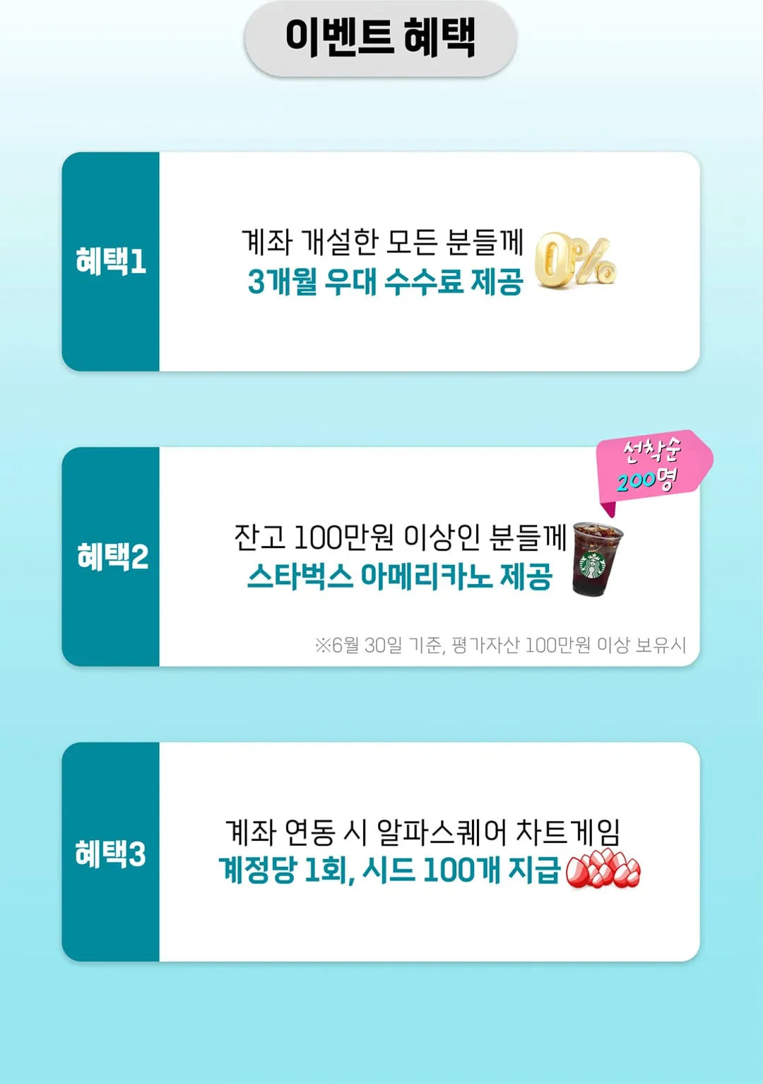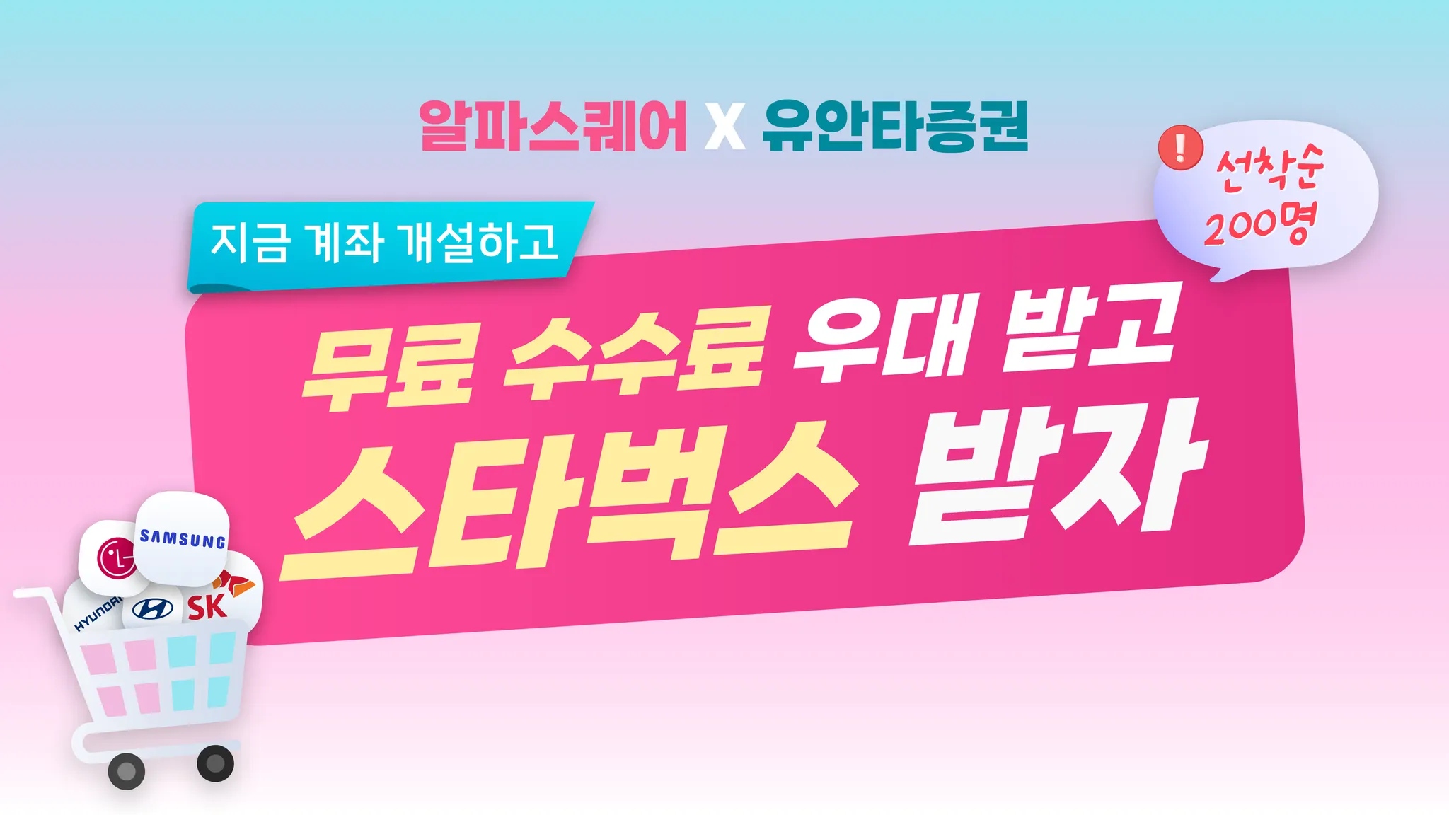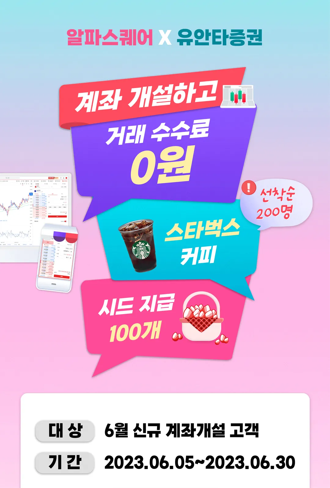 유안타 신규 계좌 개설을 완료하면 3개월간 무료 수수료 우대는 물론, 스타벅스 커피, 시드100개까지 증정해드리고 있습니다.