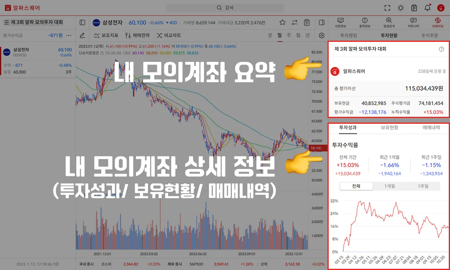 투자성과: 내 모의계좌의 수익률 변화를 한눈에 볼 수 있습니다.