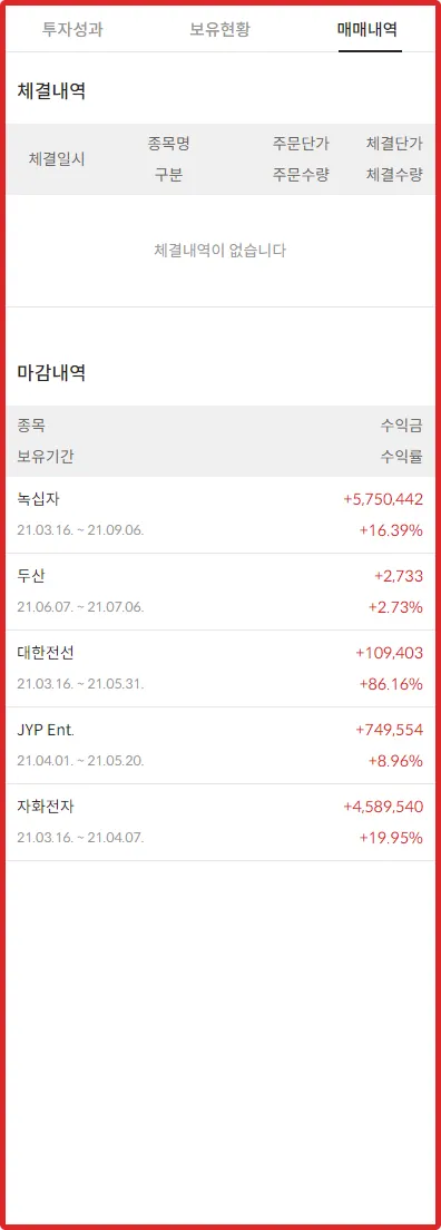 매매내역: 내 모의계좌에서 거래했던 종목을 한눈에 볼 수 있습니다.
