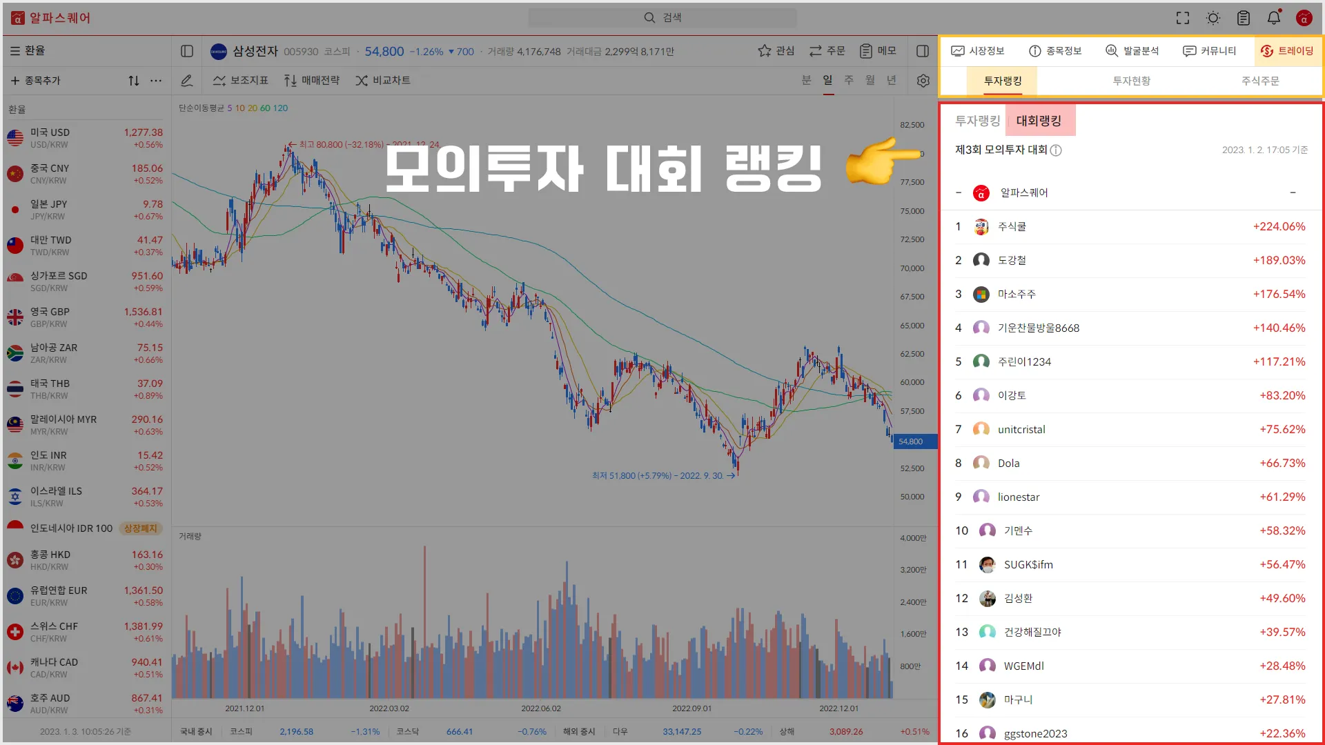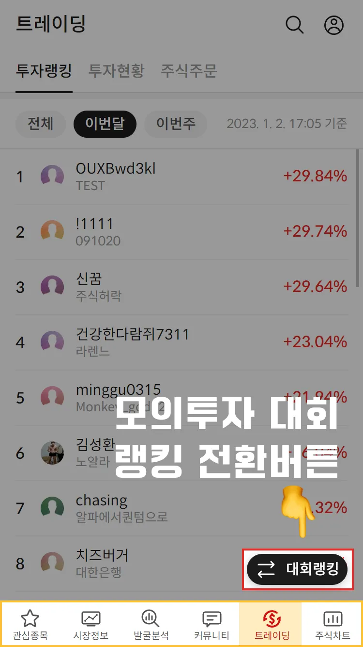 2월 초까지 모의투자 대회 계좌들의 수익률 랭킹이 공개되며 거래가 없는 계좌는 랭킹에서 제외됩니다.