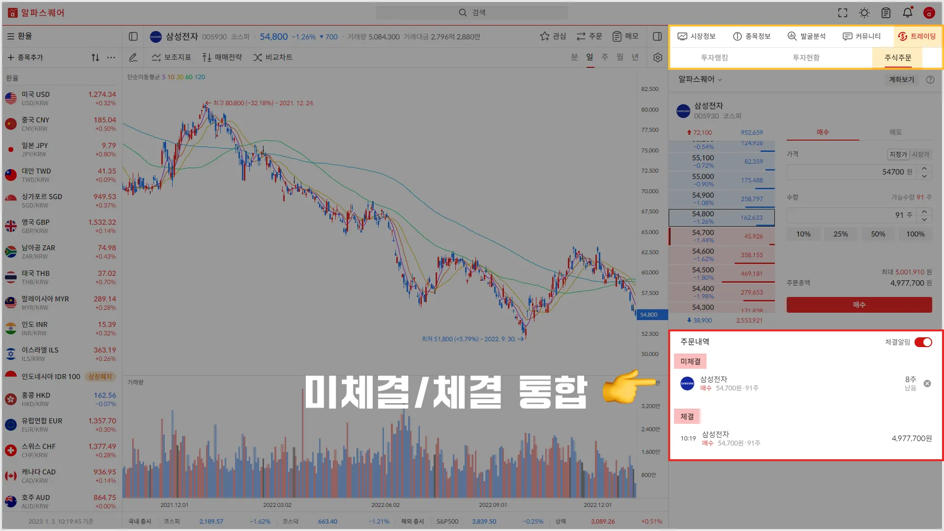 주문내역(미체결내역/체결내역)이 하나의 영역으로 통합됩니다.