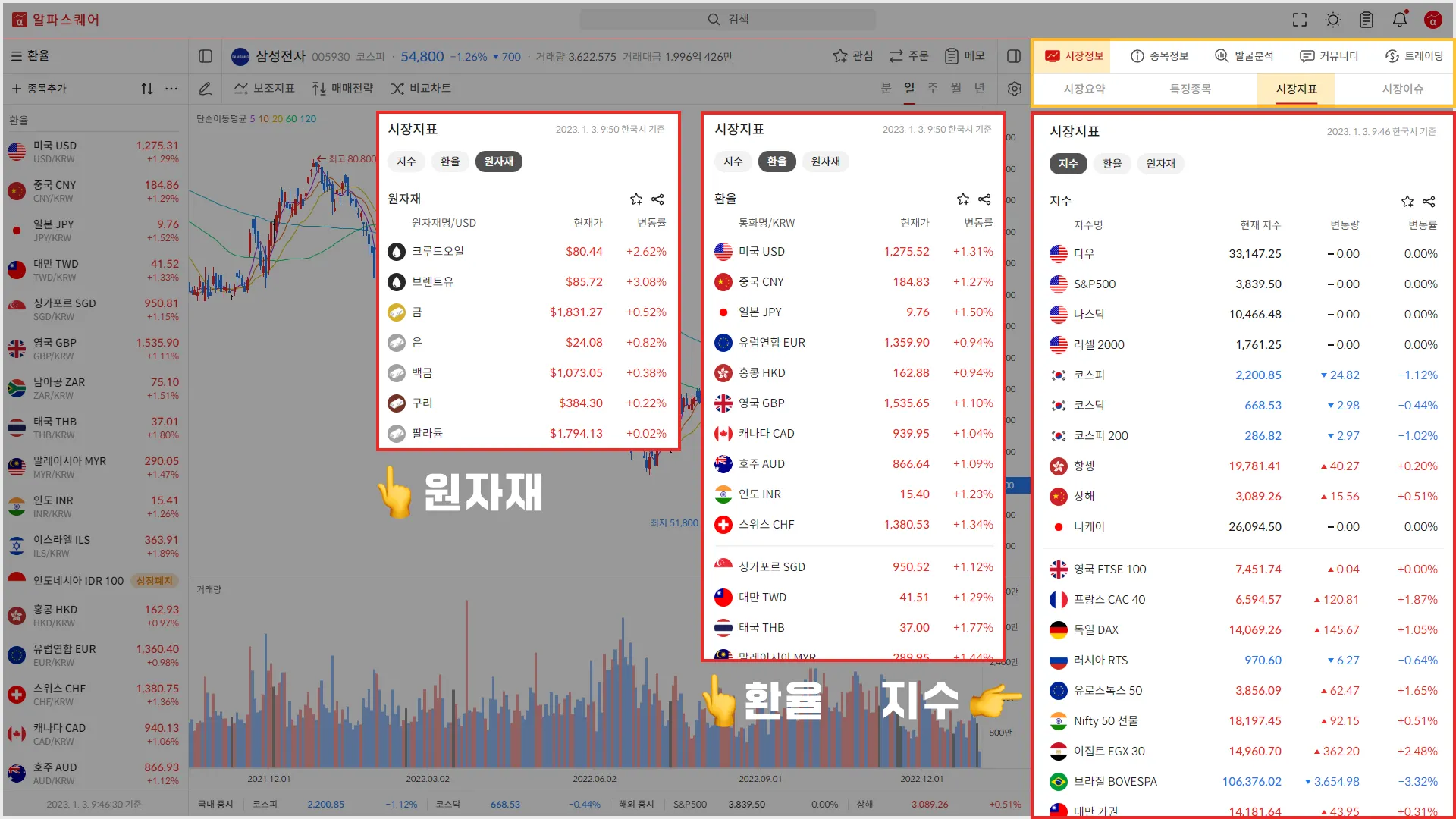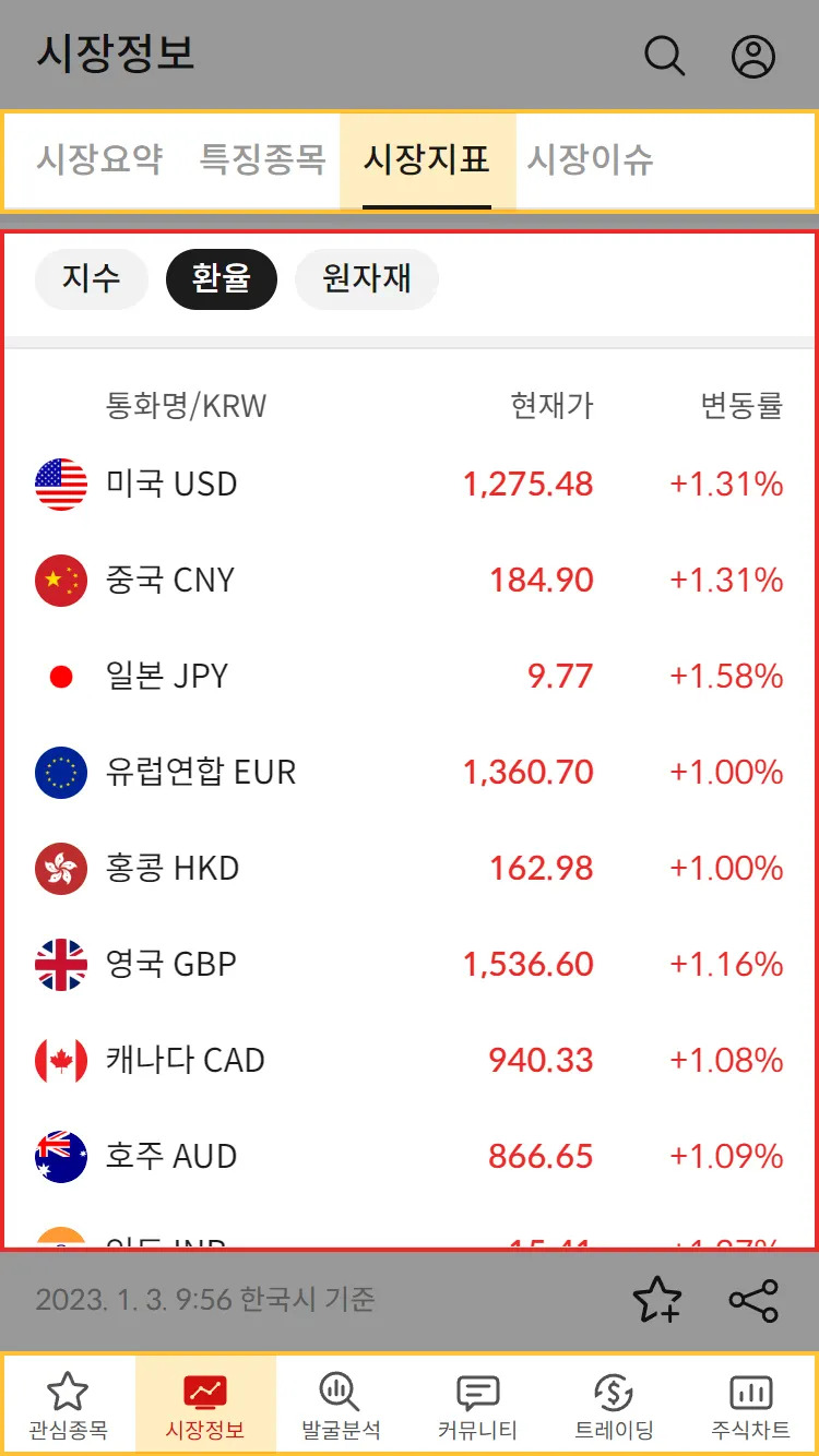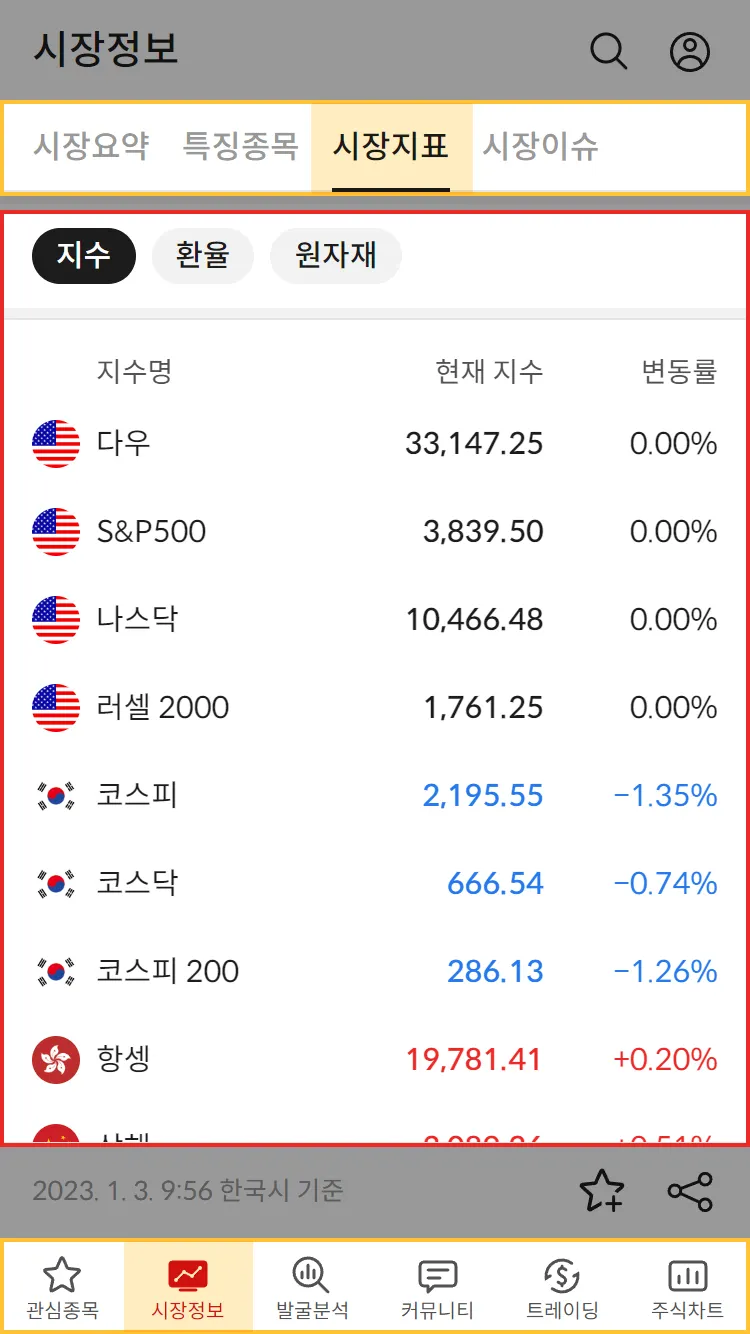 시장정보 탭에 시장지표가 추가되었으며 국내 및 해외 지수, 환율, 원자재에 대한 가격을 한 눈에 확인할 수 있습니다.