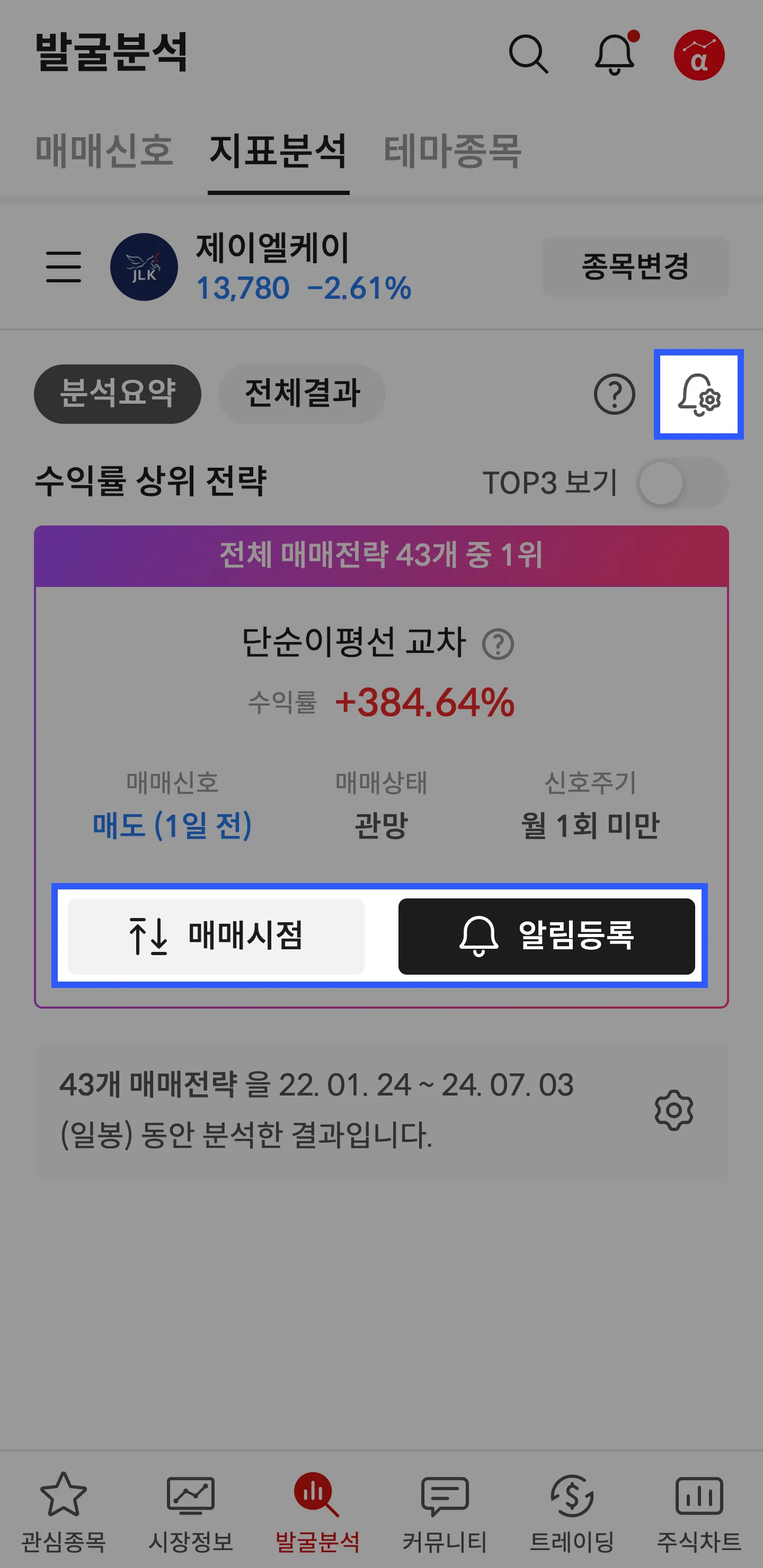 지표분석 프리미엄(별매 상품)을 구매하면 알림 등록을 통해 해당 매매전략의 매매신호가 발생 시 빠르고 간편하게 알림을 받아 볼 수 있습니다.