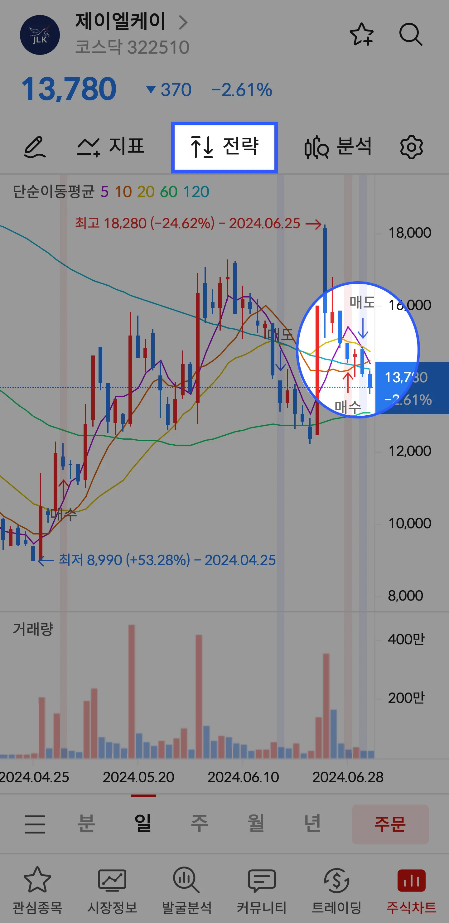 매매신호 구독 시 제공되는 매매전략 기능으로, 추후 매수한 종목에 해당하는 매매전략에서 매도 신호가 확인되면 매도합니다.