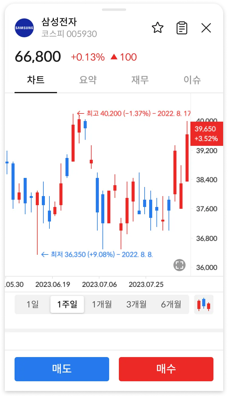 차트 탭에서 기간별 봉 차트를 큰 화면으로 볼 수 있게 됩니다.