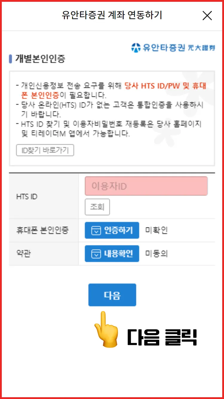 정보 입력(1-3-6. 정보입력)단계에서 입력한 HTS ID 입력 → 조회