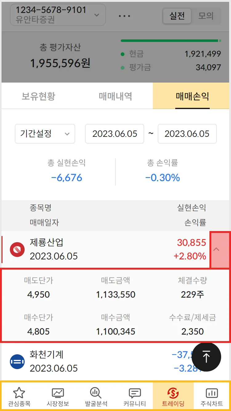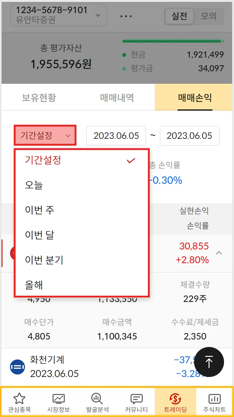 매매손익: 특정 기간의 실현 손익을 손쉽게 파악할 수 있습니다.