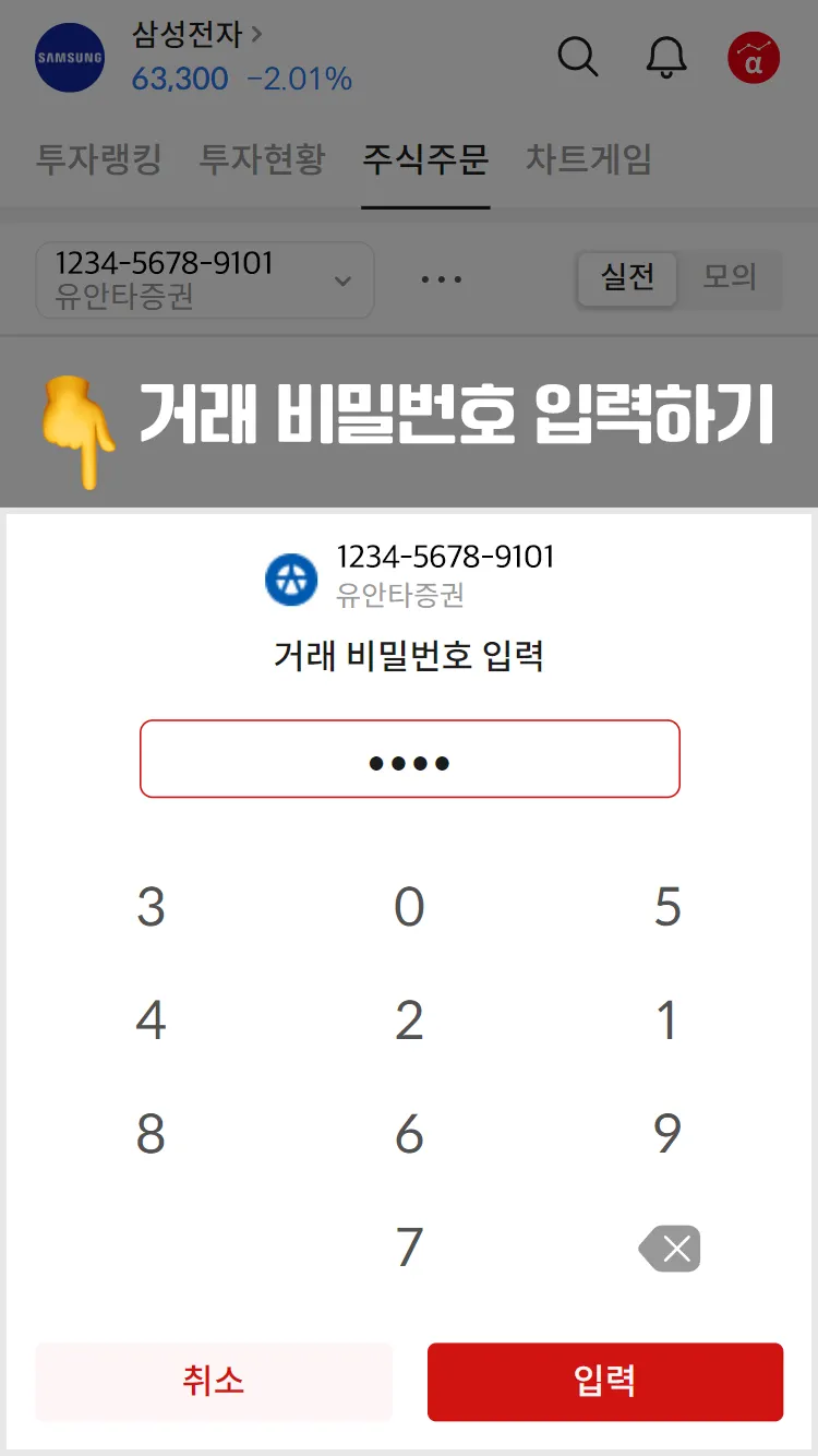계좌 생성 시 설정했던 거래 비밀번호 입력하기 (로그인 후 1회 입력)