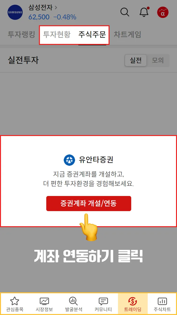 방법 2: 스마트탭의 투자현황, 주식주문탭 → 증권계좌 개설/연동 버튼 클릭