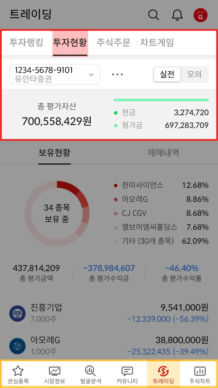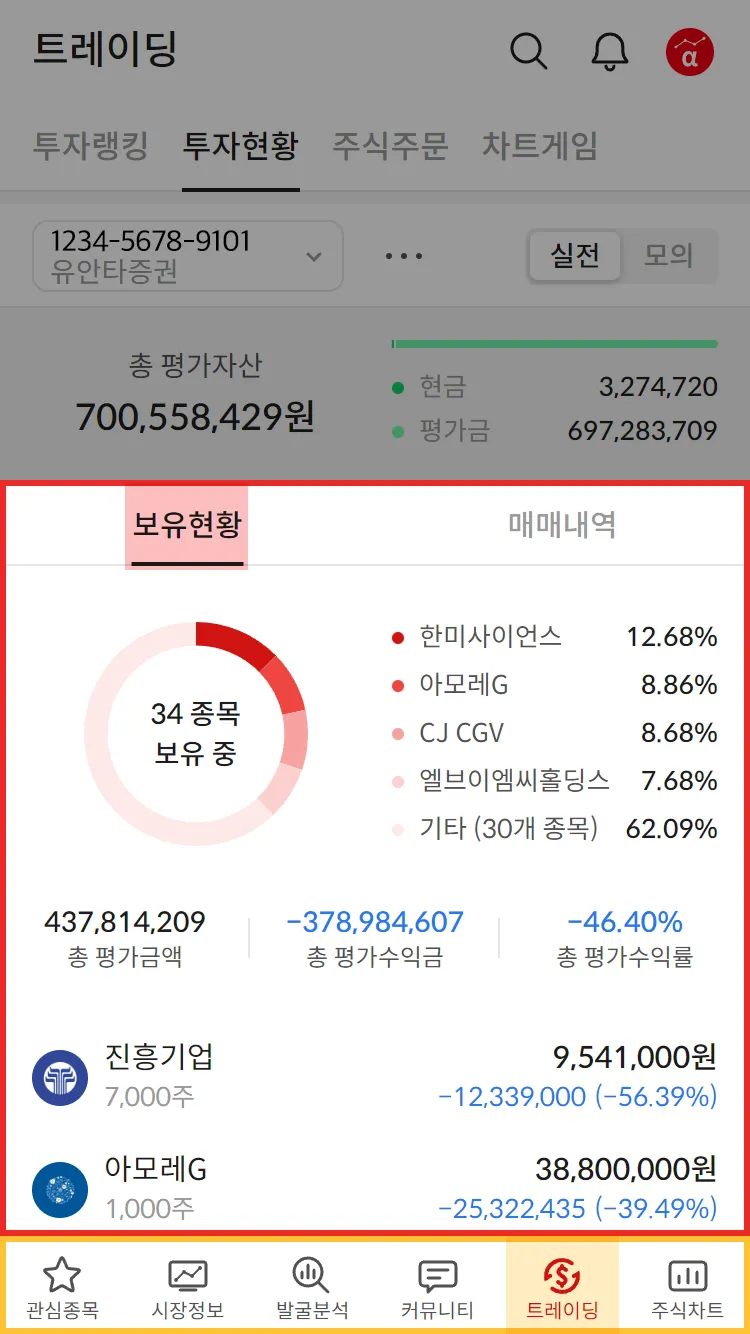 보유현황: 내 계좌에서 보유 중인 종목과 비율을 한눈에 볼 수 있습니다.