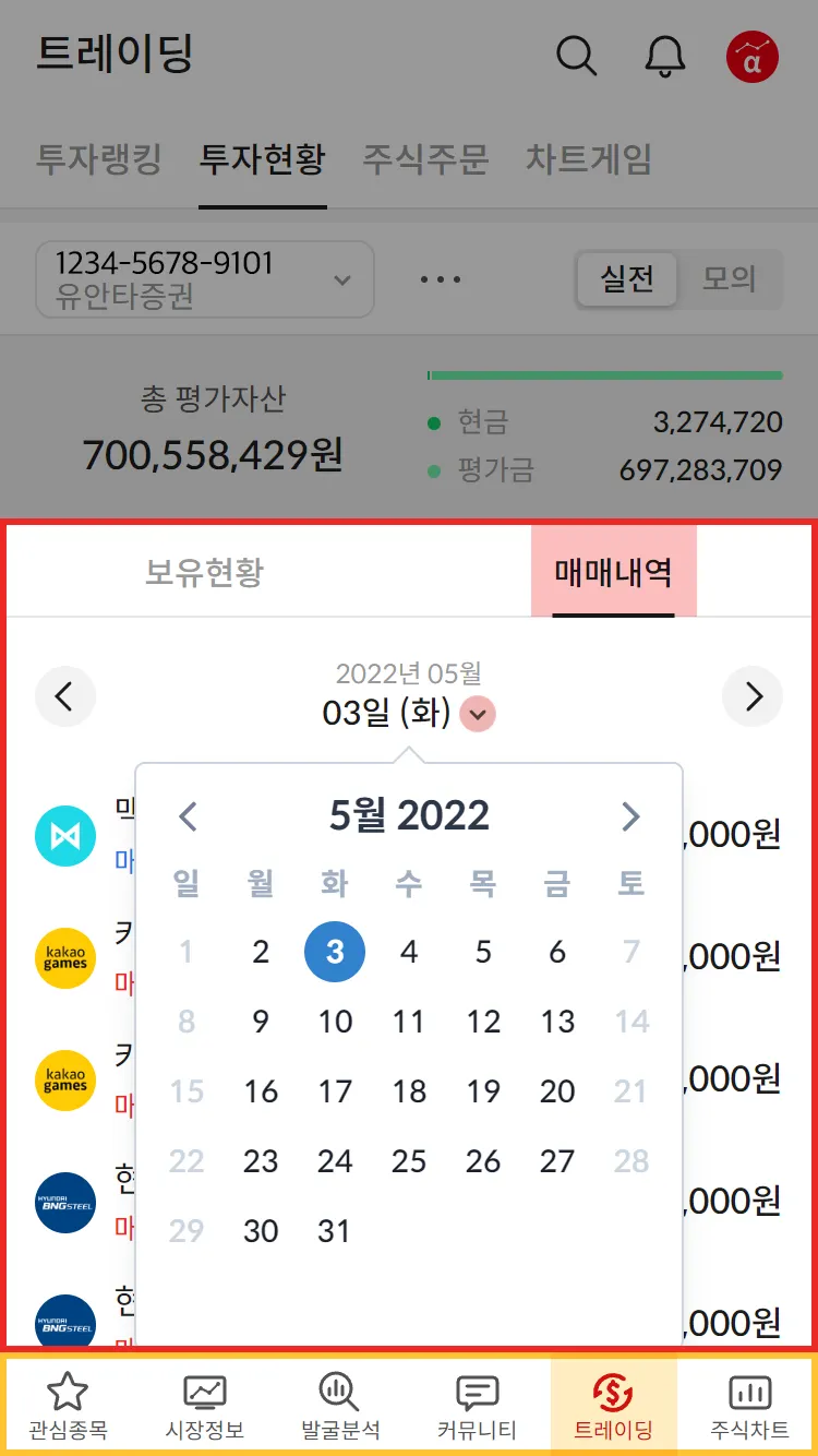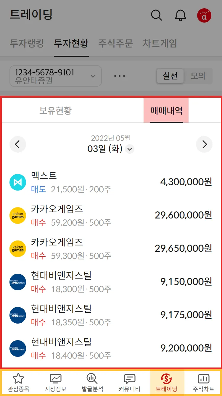 매매내역: 내 계좌에서 거래했던 종목을 한눈에 볼 수 있습니다.