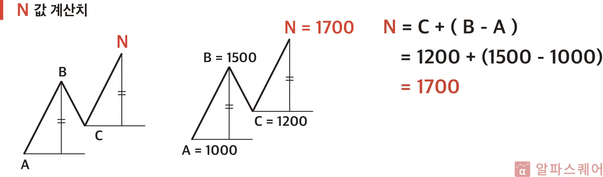N계산치 : 상승한 가격(B-A)만큼 1차 저점(C)에서 상승한 가격. 가격의 상승으로 얻은 이익만큼의 가격을 손실한 시점에서 얻을 수 있는 목표치를 추정할 때 사용된다.