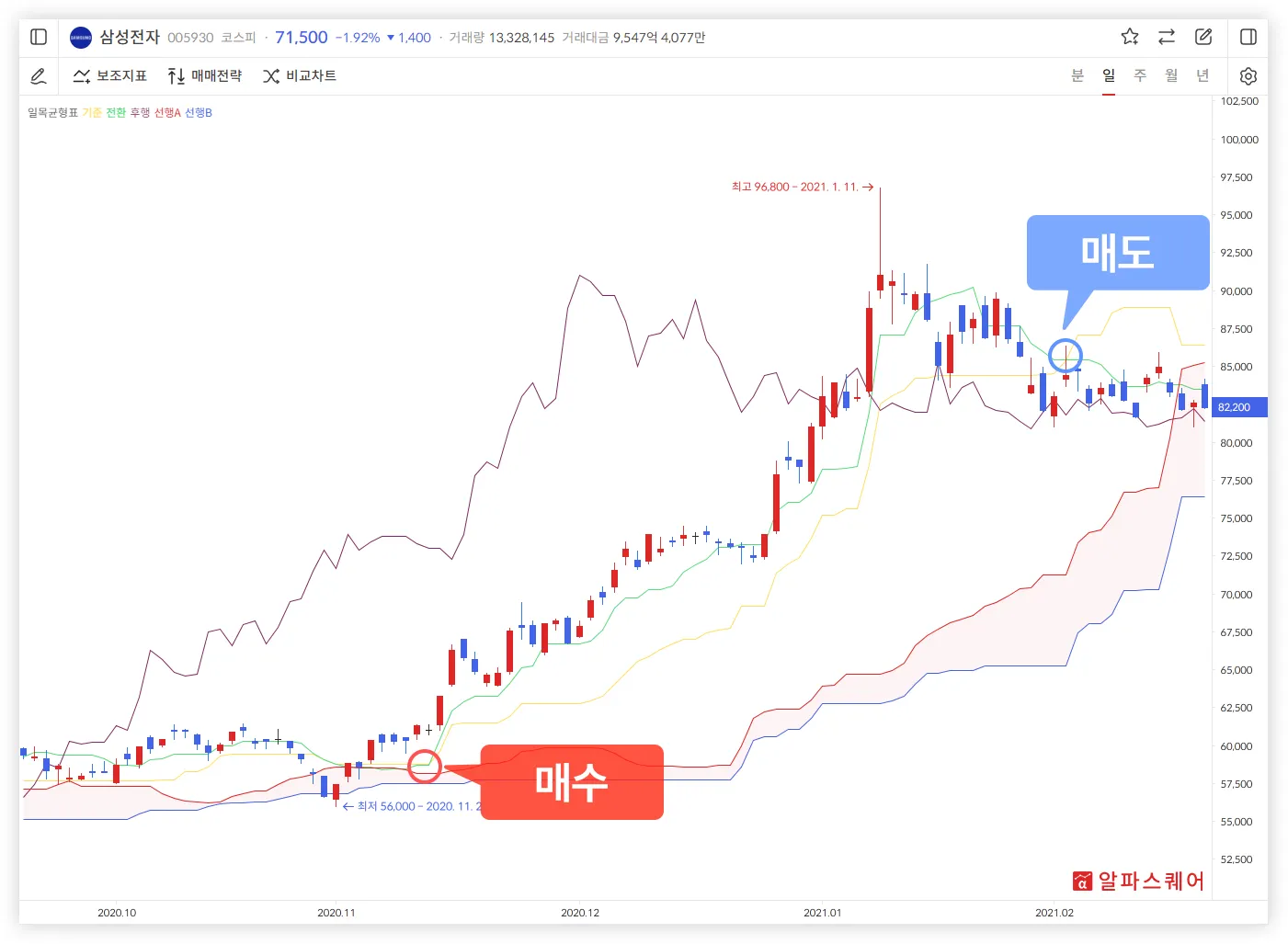 기준선과 전환선의 교차를 이용한 매매전략은 이동평균선에서의 골든크로스, 데드크로스의 개념과 비슷하다.