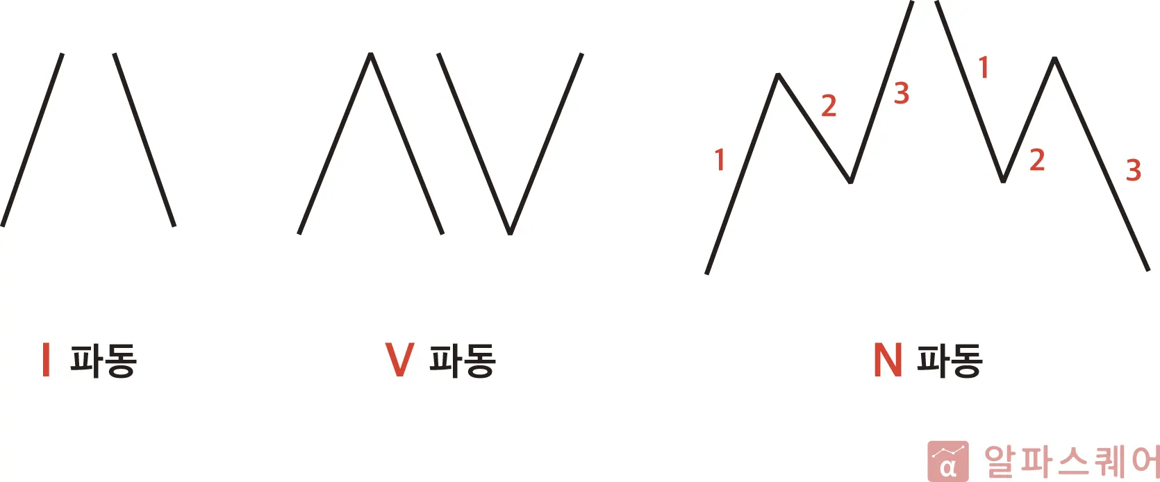 N 파동 : 가장 기본이 되는 파동으로, 상승-하락-상승 의 형태이거나 하락-상승-하락의 형태를 갖는 파동이다.