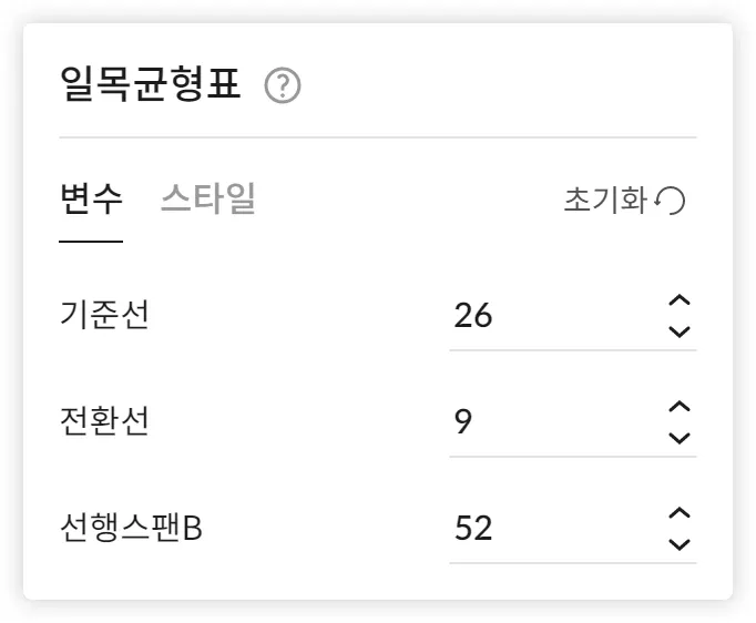 기준선: 기준선 계산시 최저가와 최고가의 기준 기간을 결정하는 변수. 기본값은 26일이다.