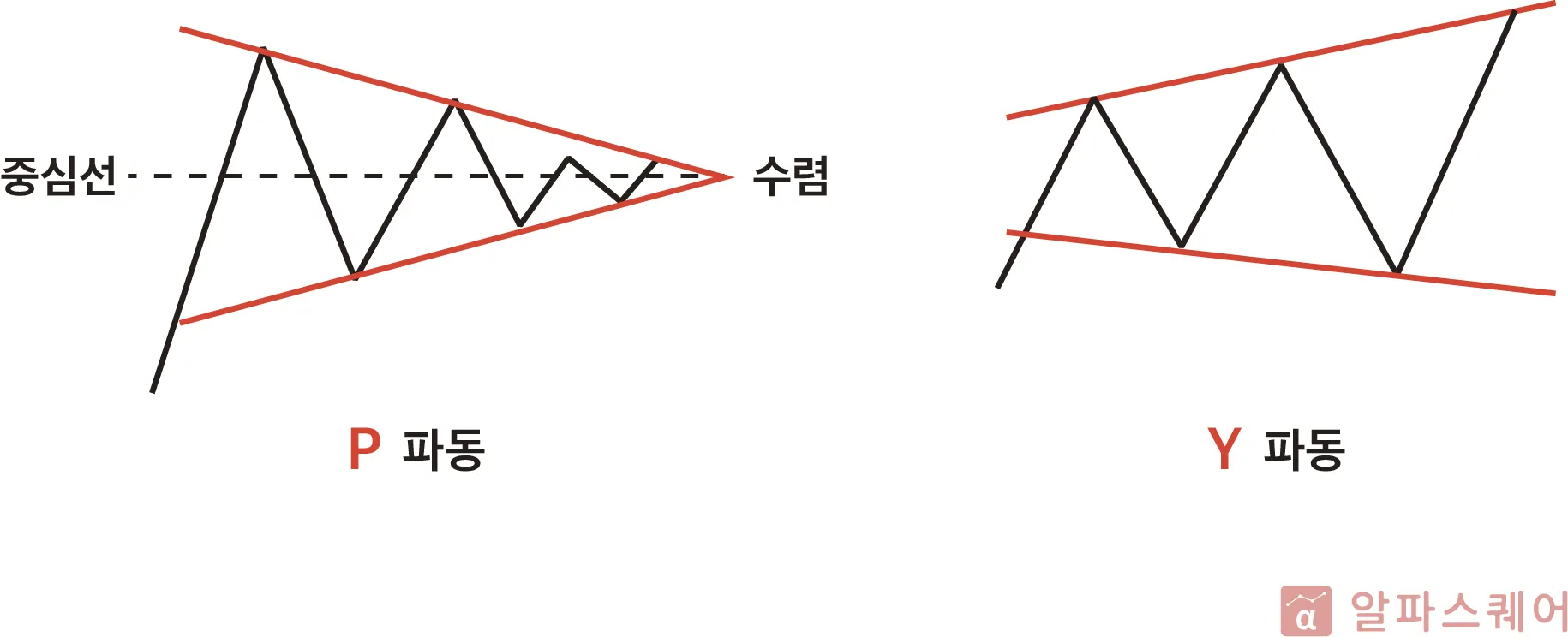 Y 파동 : 강한 추세의 끝에서 현재 추세와 역방향 추세가 충돌하여 변동성이 극대화된 형태이다. 이러한 파동은 고점은 점차 높아지고 저점은 점차 낮아져 큰 진폭으로 진행되다가 어느 한 쪽으로 움직이게 된다. 기존 추세의 전환으로 이어지는 경우가 많다
