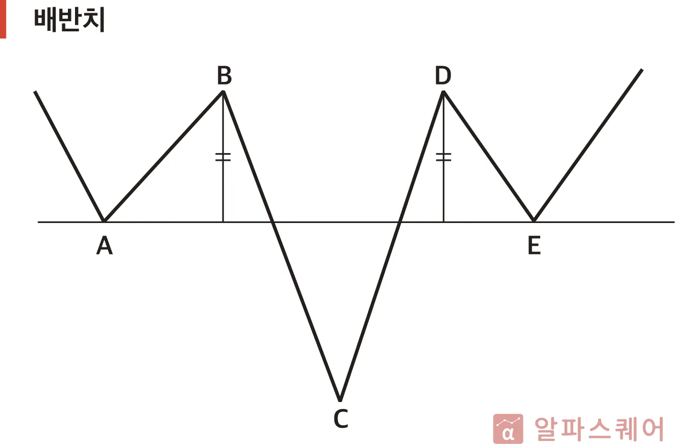 배반치 : 한차례의 큰 조정파동이 중간에 있으나 양쪽의 파동의 절대치는 변하지 않으며 이때 양쪽 파동의 절대치를 배반치라고 한다. 배반치의 전형적인 예는 역헤드앤숄더패턴(Head & Shoulder bottom)이다. C를 저점으로 D까지 상승한 시세가 조정에 들어갔을 때, E는 직전 하락과정에서 발생한 A~B까지의 반등폭과 같은 값을 갖는다.