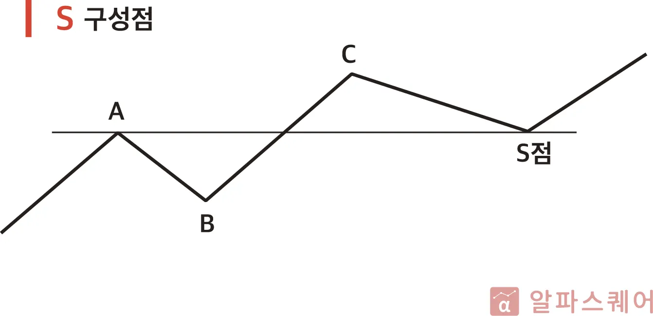 S구성점 : 상승세에서 조정이 일어날 때, 이전의 고점을 훼손하지 않는 조정 후 반등시 전 고점을 상향돌파하는 패턴의 출현이 잦다. 이 때 직전 고점을 훼손하지 않고 다시 반등을 시도하는 지점을 S구성점이라고 한다.