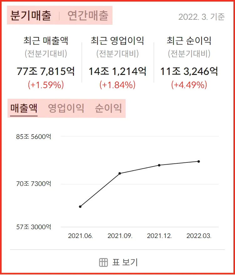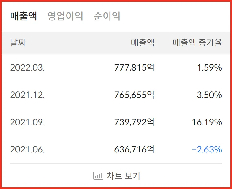 좌측중간의 매출액 | 영업이익 | 순이익 탭버튼을 통해 조회할 재무정보를 손쉽게 볼 수 있습니다.
