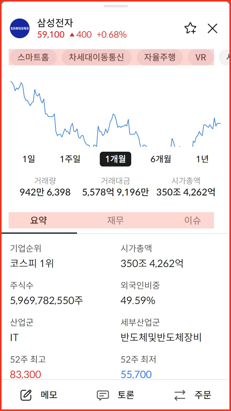 시가총액, 주식수, 외국인비율, 52주 최고/최저가 등 기업의 기본 정보를 한눈에 확인할 수 있습니다.