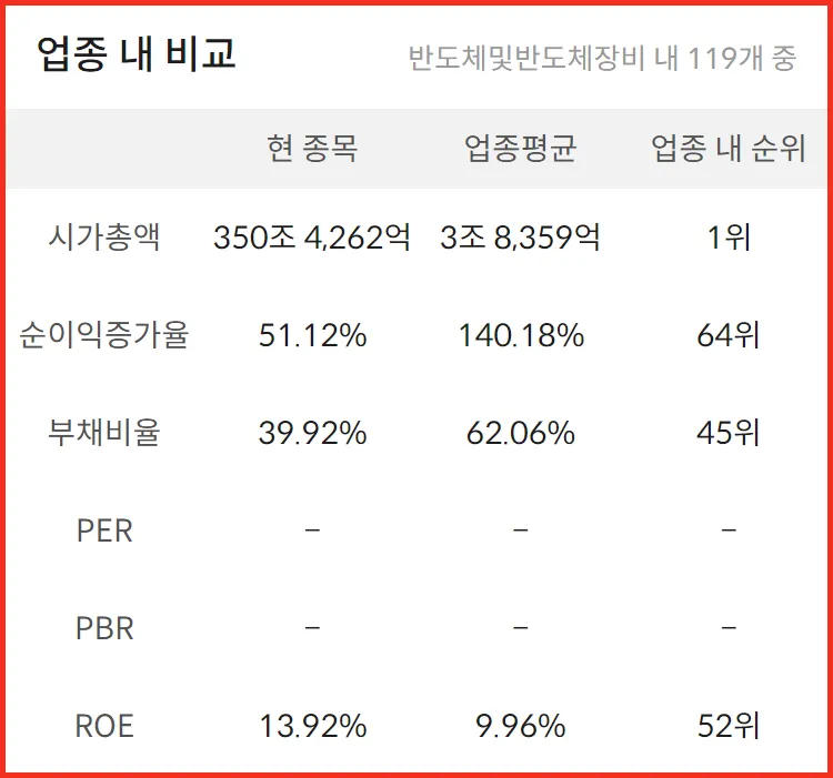 시가총액, 순이익증가율, 부채비율, PER, PBR, ROE 6가지 항목에 대해 현 종목과 업종 평균을 비교할 수 있으며 이를 바탕으로 업종 내 순위도 파악할 수 있습니다.