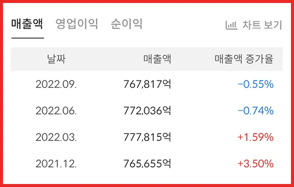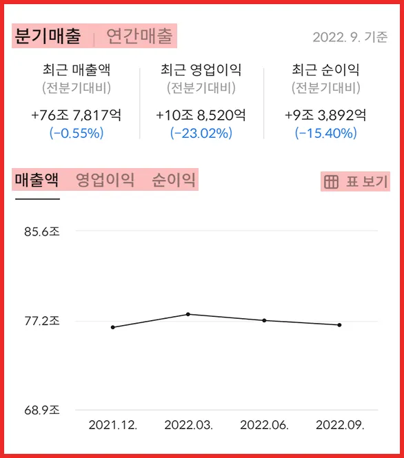 좌측중간의 매출액 | 영업이익 | 순이익 탭버튼을 통해 조회할 재무정보를 손쉽게 볼 수 있습니다.