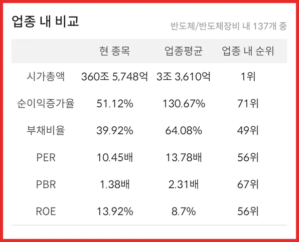시가총액, 순이익증가율, 부채비율, PER, PBR, ROE 6가지 항목에 대해 현 종목과 업종 평균을 비교할 수 있으며 이를 바탕으로 업종 내 순위도 파악할 수 있습니다.
