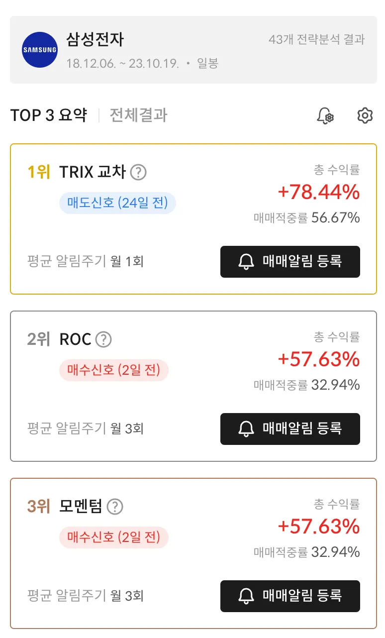 아래의 이미지 처럼 수익률 순으로 높은 매매전략 TOP3를 확인할 수 있어요.