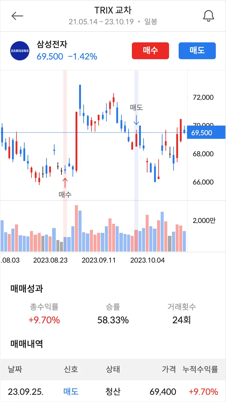 실제 차트 분석에 사용되는 보조지표 기반으로 매매타이밍이 결정되기 때문에 주관의 개입을 최소화할 수 있다는 장점이 있어요!