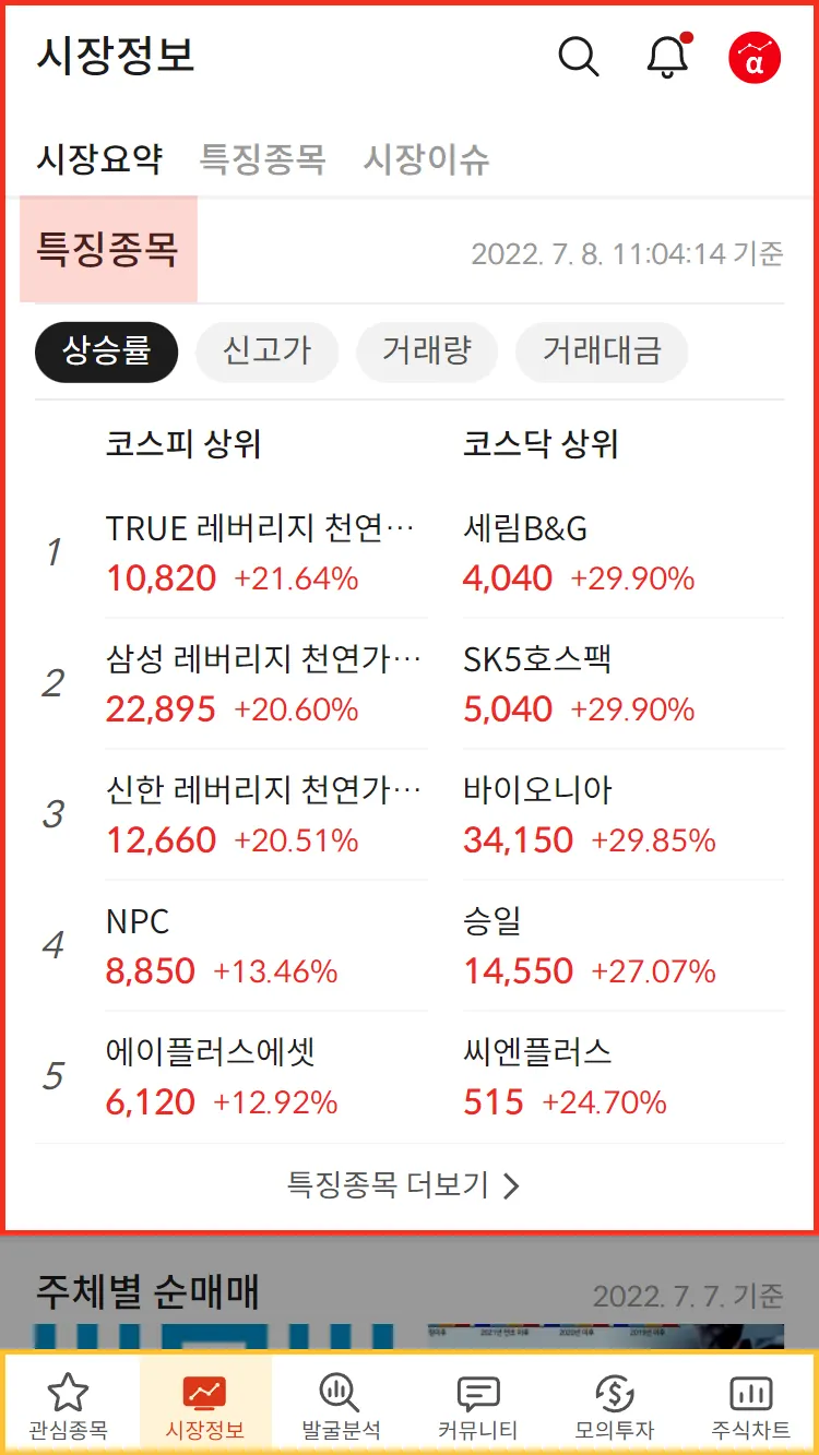 상승률, 신고가, 거래량, 거래대금 특징 종목들을 볼 수 있습니다.