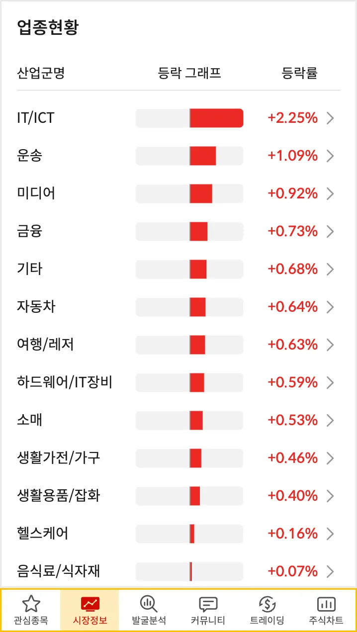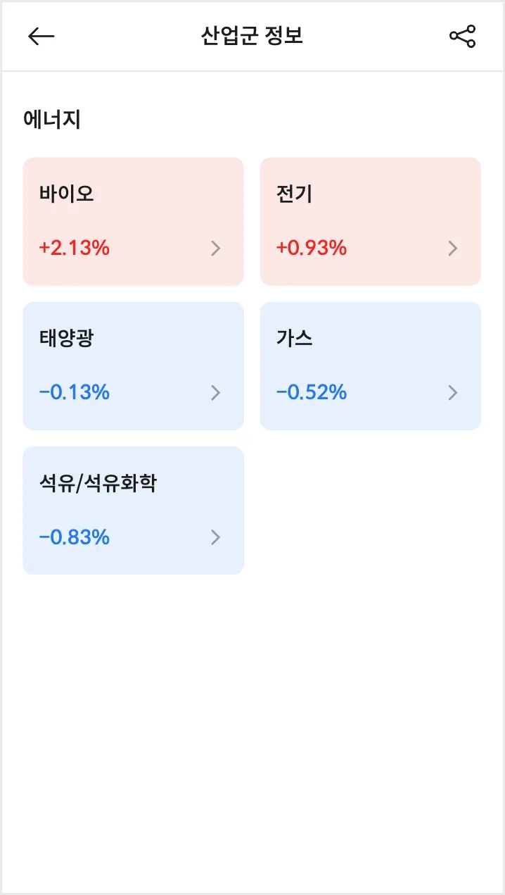 16가지의 산업군에 대한 등락 그래프로 시장의 전반적인 흐름을 직관적으로 파악할 수 있습니다.