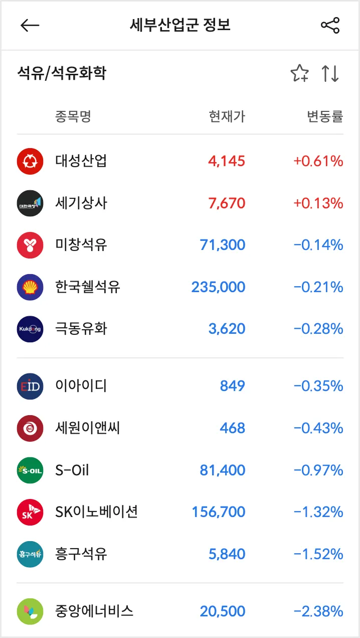 원하는 산업군을 클릭하면 각 산업군에 속한 세부산업군과 관련 종목을 확인할 수 있습니다.