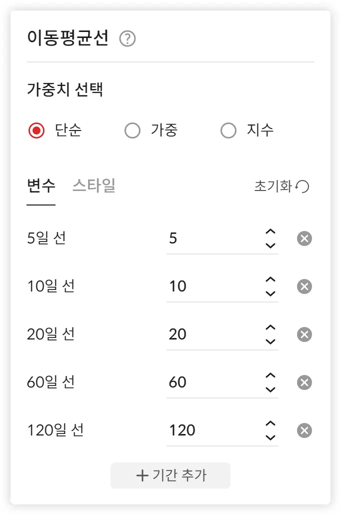 기간: 이동평균을 산출하기 위해 고려되는 기간으로, n을 의미한다. 기본값은 5, 10, 20, 60, 120