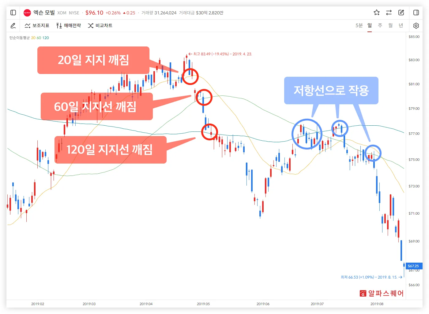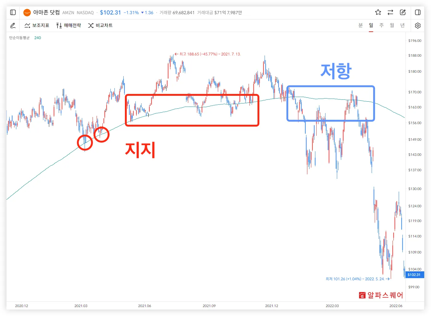 이동평균선은 주가의 지지선 혹은 저항선을 찾기 위해 사용될 수 있다.