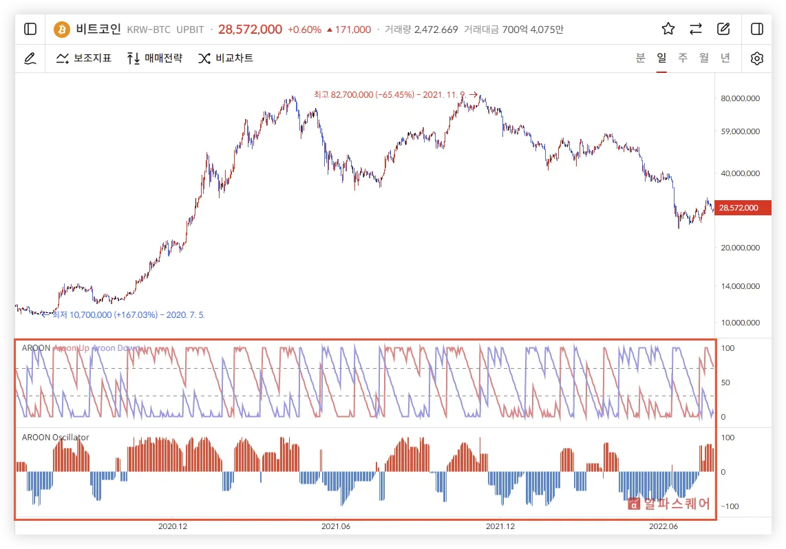 또한, 앞서 말했듯이 Aroon Up의 Aroon Down 상향 돌파는 Aroon Oscillator가 아래에서 위로 반전한 것과 같고, Aroon Down의 Aroon Up 상향 돌파는 Aroon Oscillator가 위에서 아래로 반전한 것과 같다.