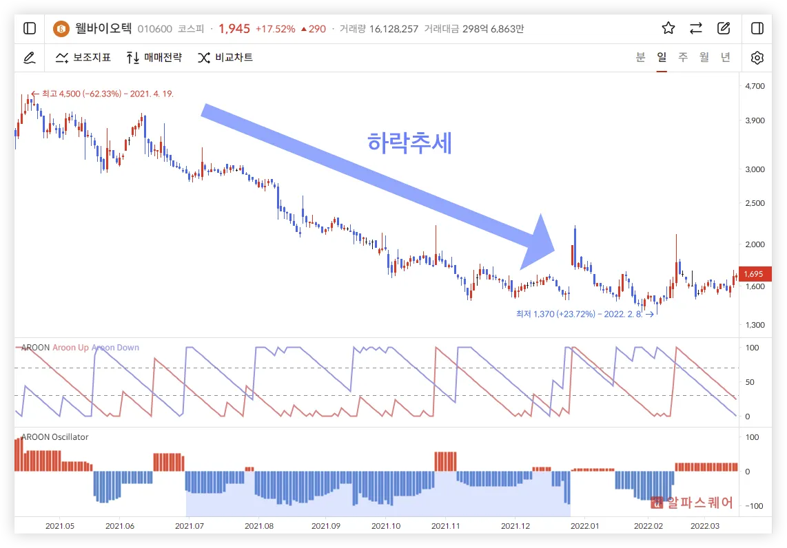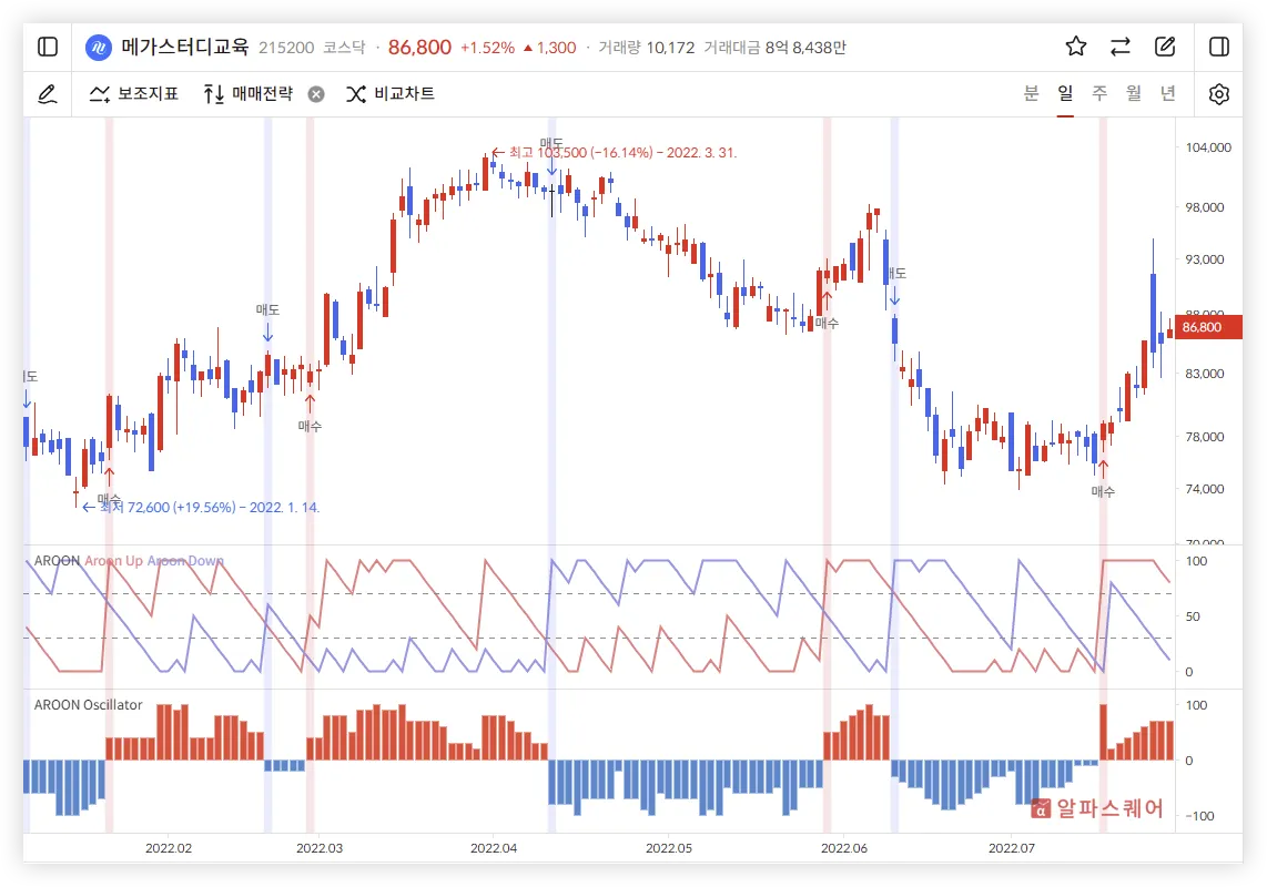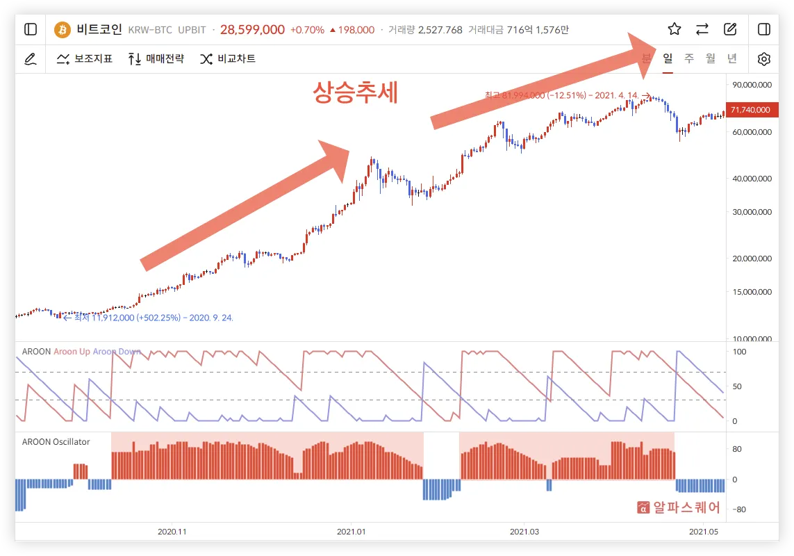 Aroon Oscillator는 주가의 추세를 직관적으로 보여준다.